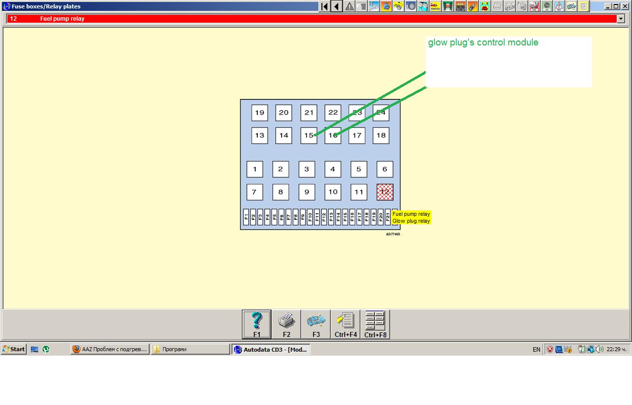Колега виж тук на 12 ми дава реле подгревни свещи на 15 и 16 някакъв модул който ги контролира както и абс и още нещо си ако не идва сигнал на 12-тото реле провери другите 2