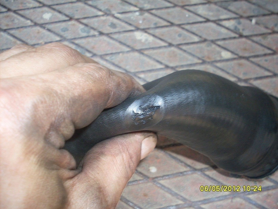 Проверих всички маркучи и съединения и открих, че дебелия маркуч към интеркулера е напукан и протрит.