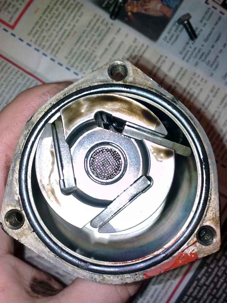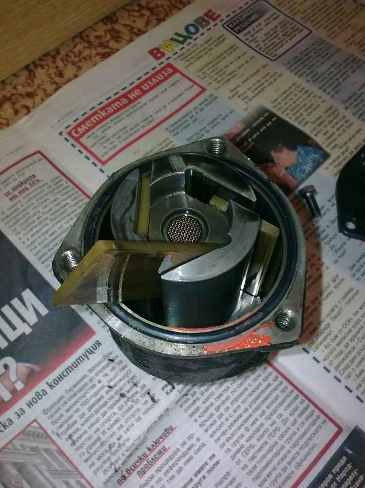 Всичко е сменено. Клапанчето, помпата и сервото бяха заминали по дяволите. Помпата след като я свалихме обърнахме ламелите и я качихме отново на колата. После с вързахме манометъра за помпата и запалихме мотора. Оказа се, че не прави достатъчно налягане и повторихме процедурата с ламелите но този път на място без сваляме помпата. С обърнати ламели вакума който правеше започна да подскача по цялата скала на манометъра, а той трябва да е равномерен. След това монтирахме новата помпа заедно с новото серво и нов клапан. Относно маслото няма нужда да се маже. Останалото масло вътре беше достатъчно и когато се запали двигателя помпата се допълнително се омаслява от маслото в двг-то. За клапана на капака на помпата не е проверявано поради простата причина, че по пътя от сервото до помпата има още един клапан в маркучите и този на капака може и да не работи което не е проблем.