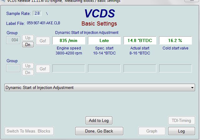 Тази помпа не се настройва по този начин. Влизаш на Basic settings 4-ти канал и пускаш теста ( с Go) и компа кара помпата да направи максимално предварение и закъснение. На закъснение трябва да си от -3 (изписва 3ATDC) до 0 про 100,2% cold start valve. На предварение трябва да достига 15 градуса и да застопорява на 14,4-14,6.