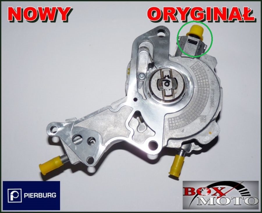 От тандем помпата тече масло от към вакумната част и ми предстои сваляне и смяна на всички гарнитури, О-пръстени, семеринга и т.н. с ремонтен комплект. Въпроса ми към знаещите и можещите тук е - СВАЛЯ ЛИ СЕ ТОЗИ ПЛАСТМАСОВ ВАКУМЕН ЩУЦЕР ОТ КОРПУСА НА ПОМПАТА /на снимката е в зелен кръг/, за да може да се разкачи от вакумните пътища? Помпата е PIERBURG с номер по WAG 038145209 и се различава от по-старите модели помпи с валцования в корпуса на помпата щуцер, който се разбиваше и правеше проблем. Теча не е от там, а от средната гарнитура на помпата!