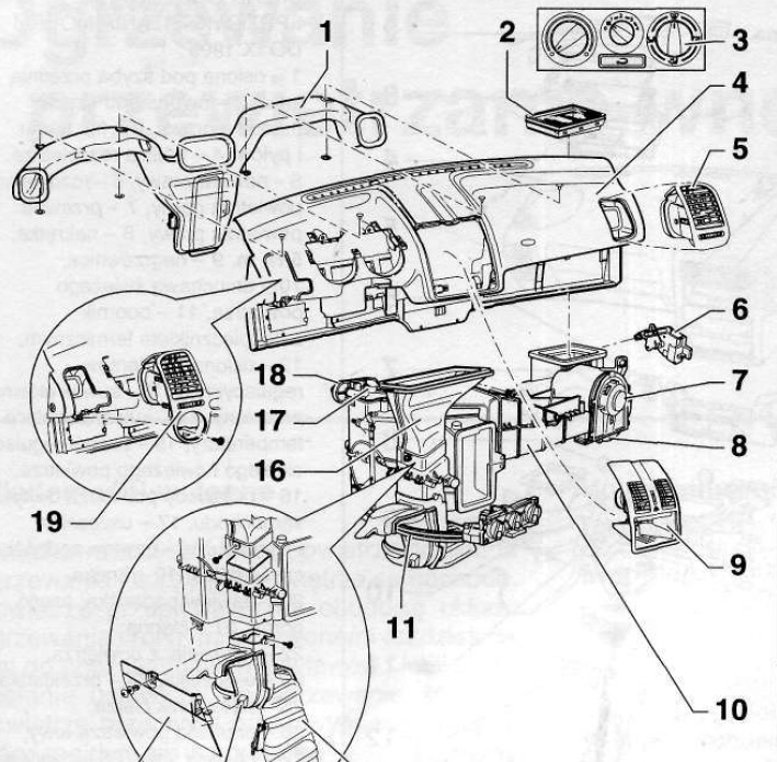 Демонтира се радиото и рафтчето под него.Сваля се детайл 9 на който е триъгълния бутон