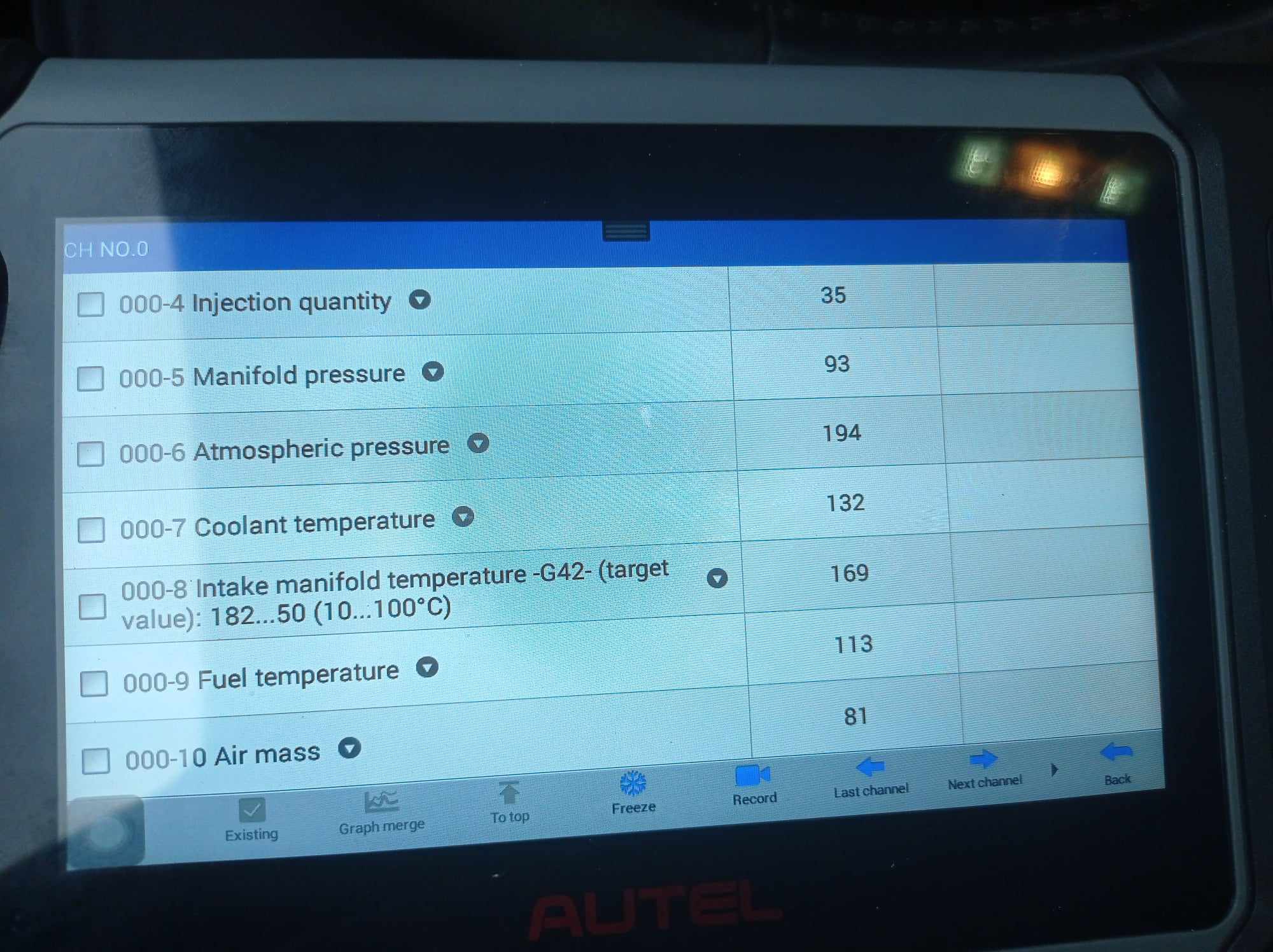 Смених го защото има "теч" от пиновете. Черни датчици вече няма, всички са изтеглени и са заменени с въпросните зелени. Купих два зелени на две различни марки, същата работа. Четох ги, но не с ваг ком. Старият ми датчик който тече, показва малко по ниски градуси на 5ти и 7ми канал. С новите датчици малко повече показваше. Обаче с новите датчици пуши и тресе на прибиване. Та си върнах стария черния датчик. Има един канал 0 с тази диагностика която го чета, сега ще прикача снимка Тук е с новият зелен датчик. Със стартият черен стойностите на 000-7 Coolant temperature са около 190. Не знам защо на този канал 0 ги изкарва така,а не със градуси. Може би на канал 0 градусите ги дава във фарнехайт?