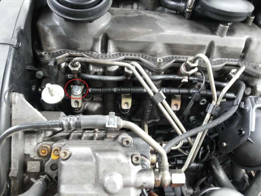 Преди няколко дни както си карах по магистралата с около 140км/ч изведнъж се чу единично пукане и колата загуби мощност и двигателя започна да тресе и да работи като на три цилиндъра. Веднага спрях и видях, че имам скъсан болт на една от "скобите", които натискат дюзите - вижте снимката за по-голяма яснота, оградил съм болта в червено. След смяната на болта нещата не се оправиха. Откачих маркуча от страната на студената част на турбината, бръкнах вътре и видях, че не се върти все едно е заклинила.