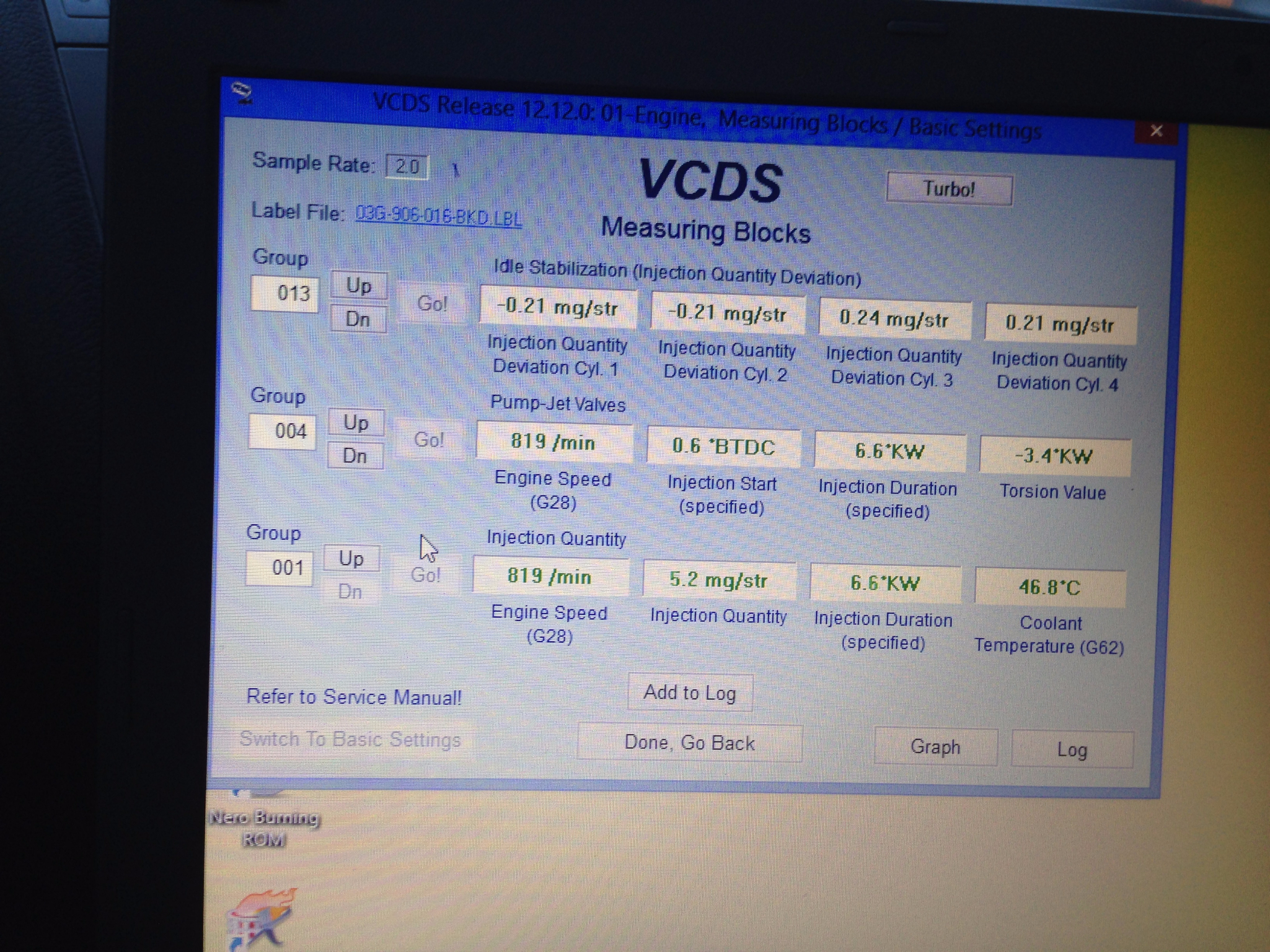 Девиацията на дюзите е супер, но Torsion value е ниско. Добре е да е около нулата, а при мен най-добре върви колата при +2. Имай предвид, че при промяна на синхронизацията се променя разхода по борд, но не винаги коректно. Най-точно показва при 0,0, при минусови показания (закъснение) показва по-малко от реалното, а при плюсови (предварение) повече от реалното. Това, разбира се, може да се коригира с Вагком. Това, което пиша е за 1.9 BXE и не знам доколко е относимо към твоят двигател.