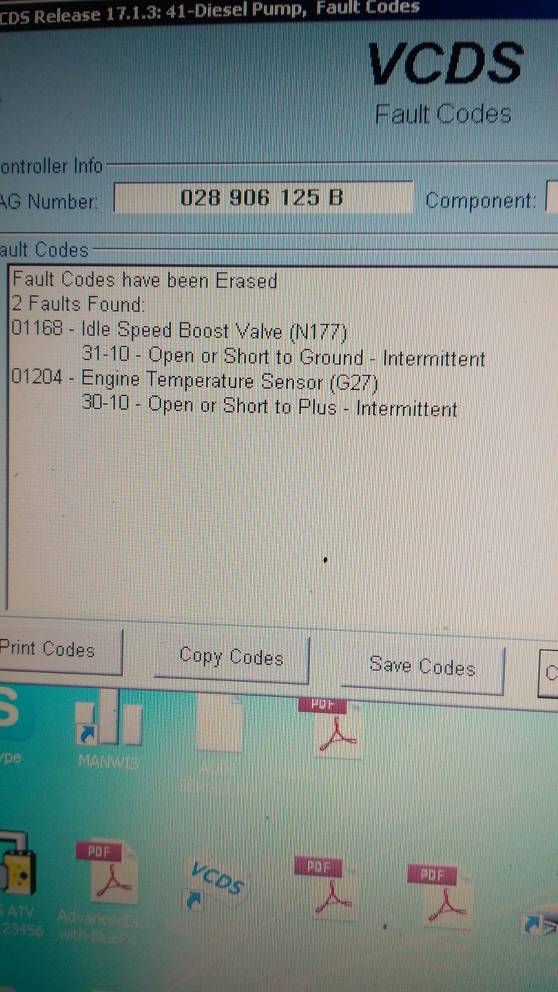 Такаа...датчика беше отрязан,единия проводник беше замасен директно,не знам защо.Оправих връзката и грешката изчезна.Обслужих я и след като смених горивния филтър,задържането на газта изчезна,съответно и грешката и.Остана само клапан N177 ,който като включа и колата загрее оборотите падат до около 900 и вибрациите са страшни.Смятам просто да отпусна авансатора още малко.На прав път ли съм?