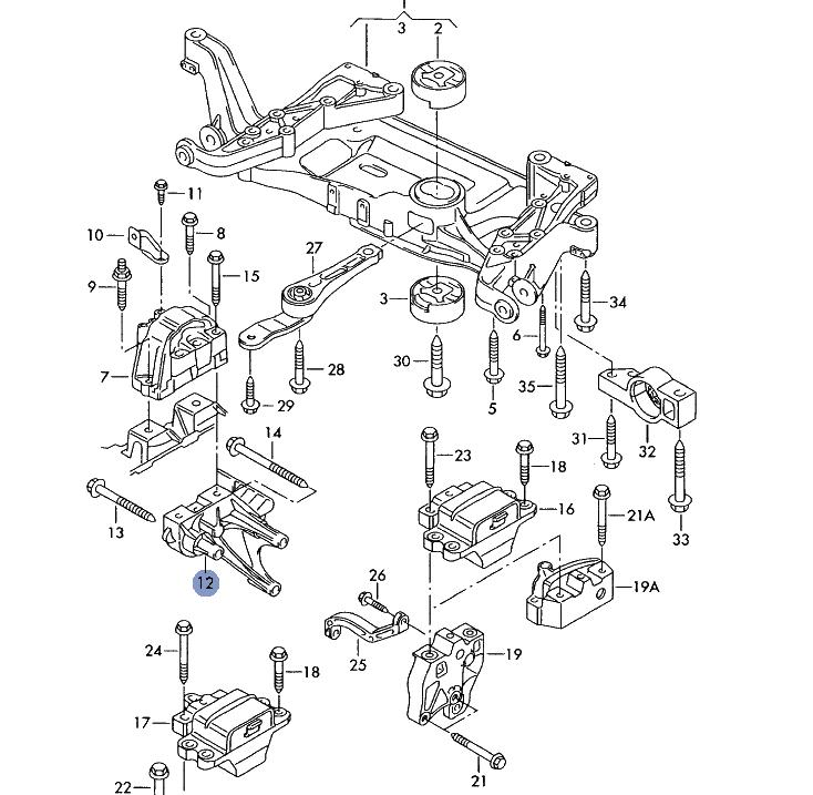 Номер 7 е десния тампон (от страната на двигателя), номер 12 е конзолата, която е връзката между блока на двигателя и тампона (тази алуминиевата пред капака на ангренажния ремък). Според описаното от теб, ти трябва номер 12. Ако е така, двигателя ти практически трябва да виси във въздуха от дясната страна (което е много голям проблем).