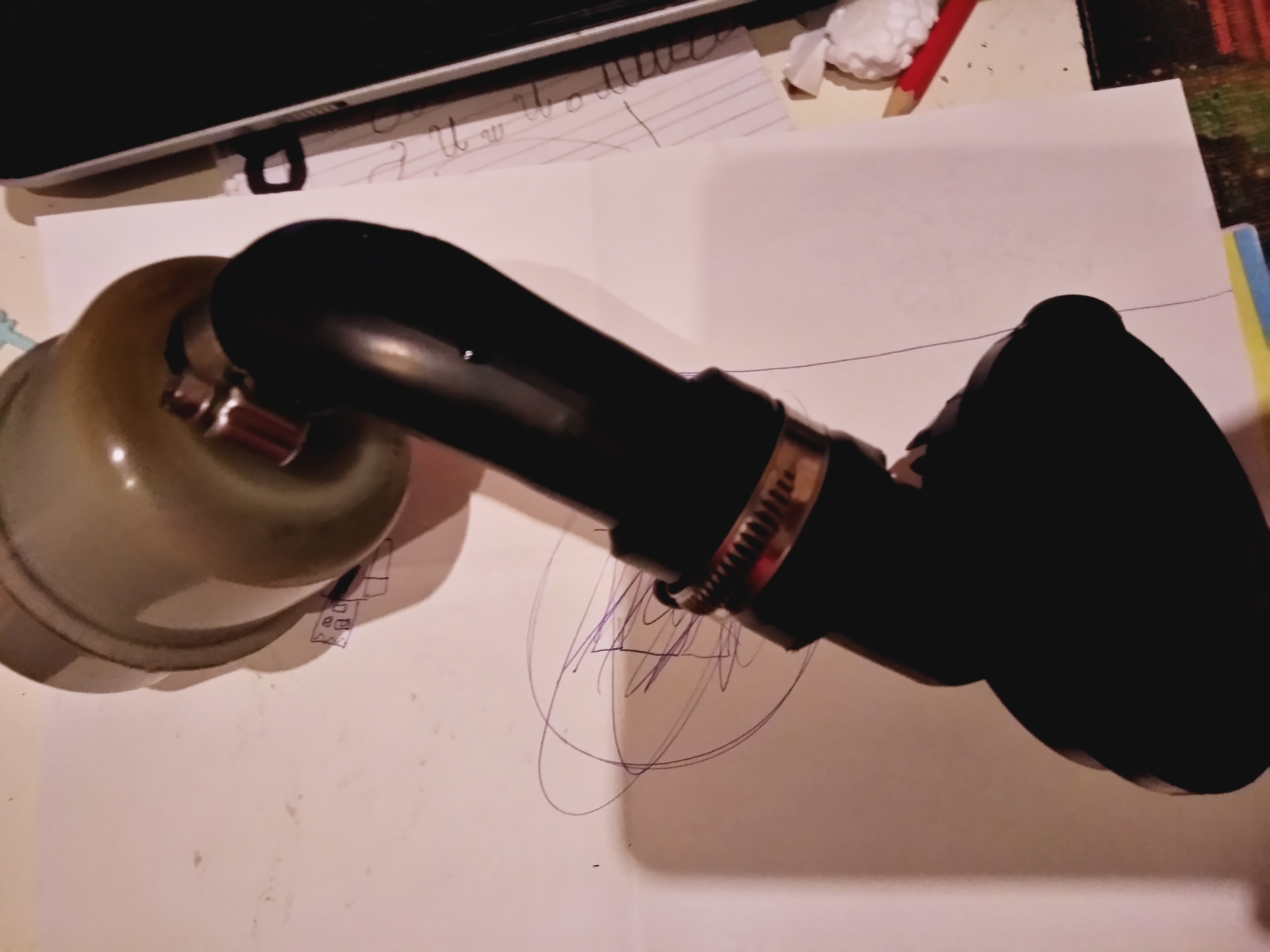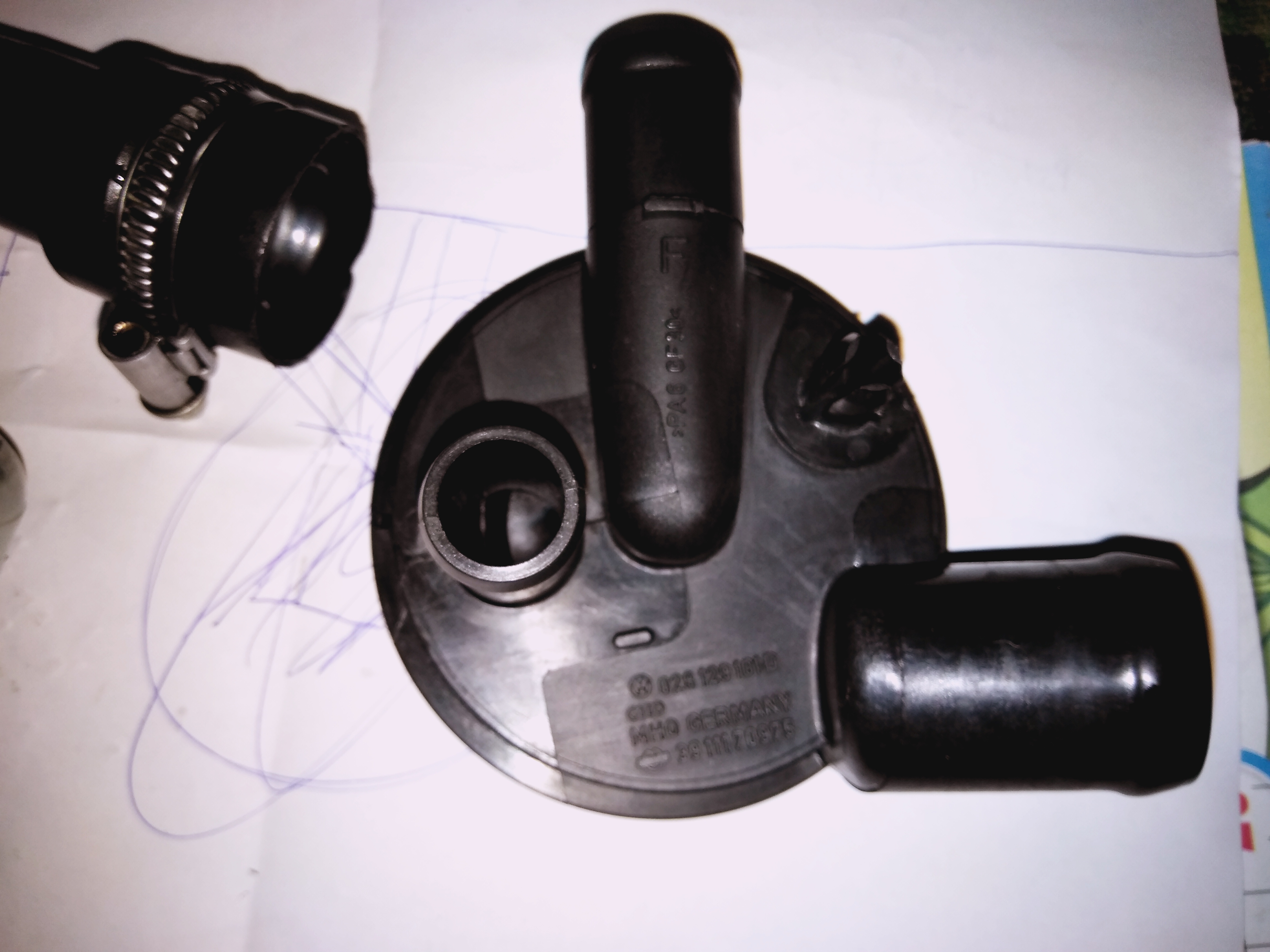 На втората се виждат и трите щуцера. Този, на дъното се забива през гумено съединение в капака на клапаните. В по-дебелия влиза тръбата от ниската част на двигателя / картера. По-тънкия влиза в дебелата тръба /въздуховода след въздушния филтър на двигателя. Та, коя запушвам и в коя смуча?