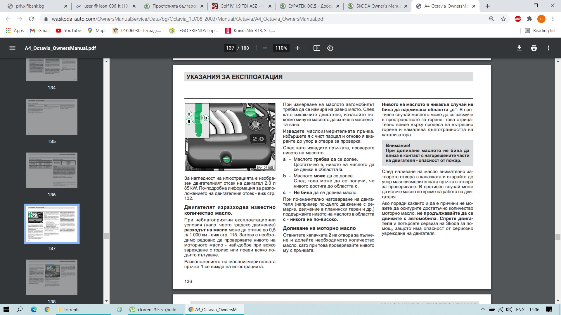 Мерси за отговора колега, не нямам проблем с покачване на нивото на маслото. Просто сменях масло днес и след като го източихме хубаво като двигателят беше загрял до 90 градуса и с отворена капачка за доливане.Забелязах че като наляхме 4.5 литра и оставихме мотора да поработи 1 минути за да завърти в масления филтър маслото беше на горната чупка на щеката а по принцип е по средата на защрихованата част след като налеем толкова. След като наляхме изчакахме 1 цигара време за да се стече за да покаже точно. Не знам дали е проблем да е над защрихованата зона, но намерих това в книгата на VW - . Преведено от италиански - А - Не трябва да се долива още масло, Б - Може да се долива още масло; C - Задължително трябва да се долее масло.