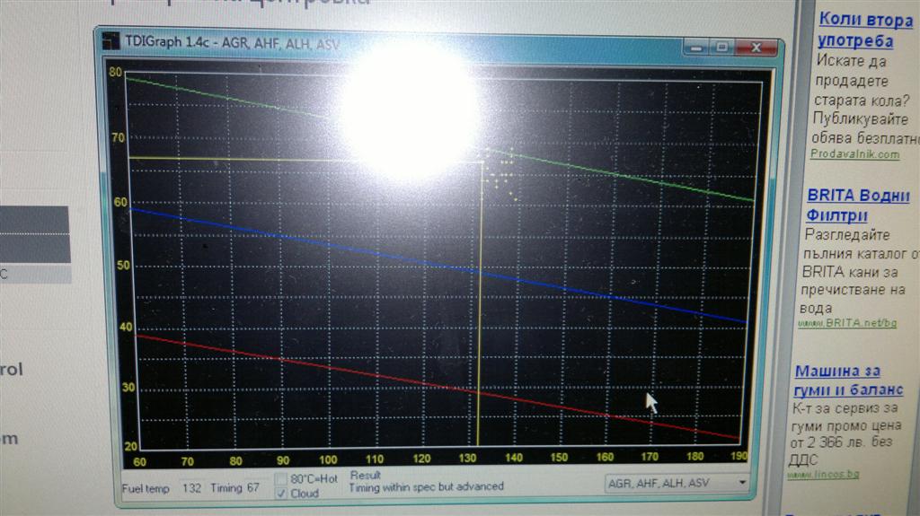 На скоро си взех Голф 4, 1,9 АHF. Колата не искаше да върви както трябва. Разхода също беше завишен. Реших да я закача на VAG-COM и всичко се оказа добре. Центорвката на говирната помпа не беше в норми поне до колктото забелязах по това което намерих за нея. В ТДИ тайминг влязох да погледна графиката на центровката и ето как беше
