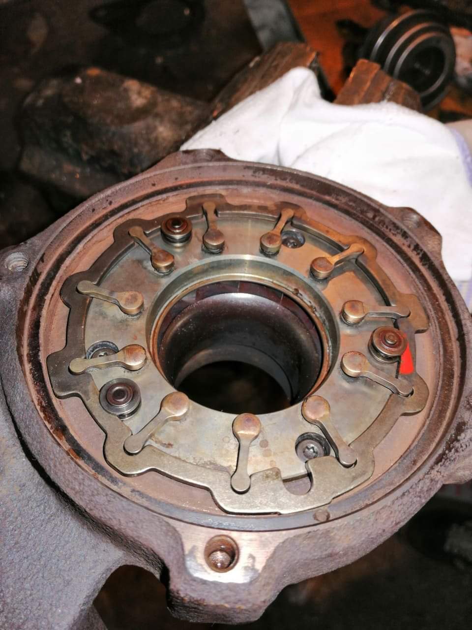 След това се подреждат трите дистанционни втулки и слагаме геометрията. Геометрията има само едно положение за монтаж, слагаме трите винта М4x20, слагаме гривната на геометрията(аз я бях белязъл за да знам как е била да не я обърна), ролките на геометрията и трите щифта на ролките. Палеца където се закача лостчето на геометрията трябва да сочи към към отворчето за щифт в чугуна, там влиза горещата страна на ротора към чугуна. Слагаме 5-те болтчета на топлата страна и планката на актуатора и затягаме.