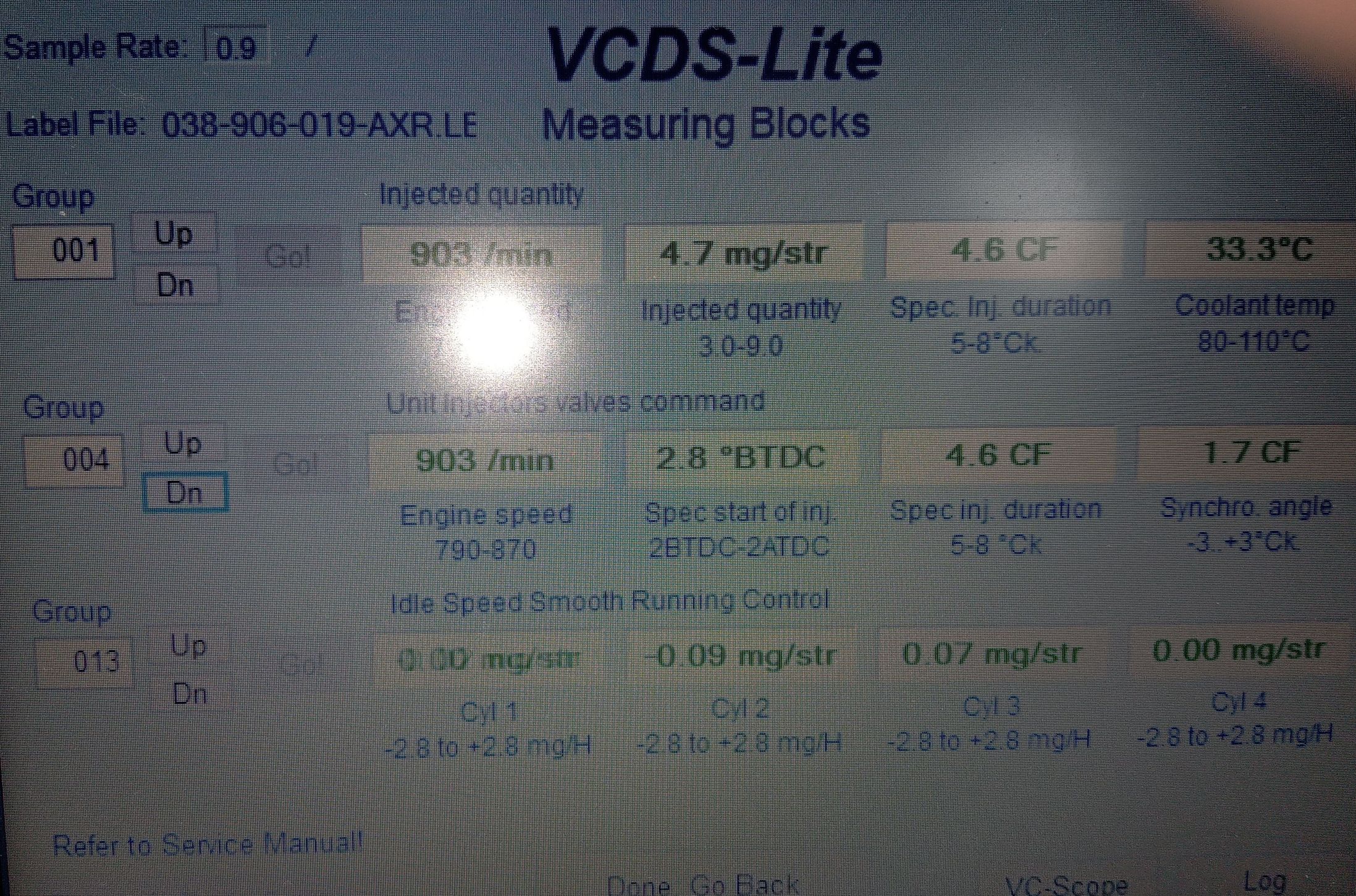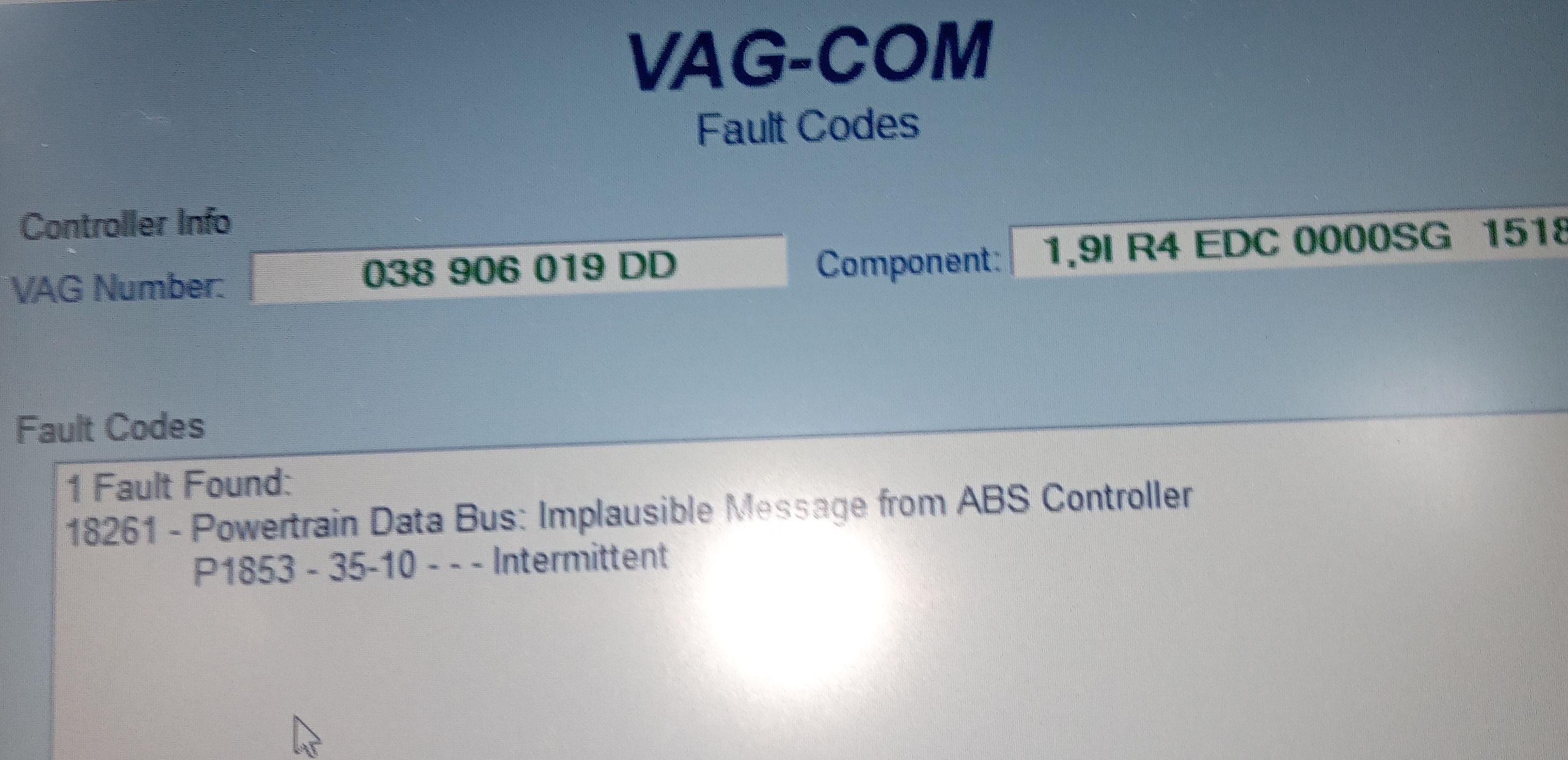 Дюзите са перфектни, милиграмите са леко ниски може би затова тресе трябва да се намали синхронизацията на вала от 1.7 на 1 или 0.5 някъде и милиграмите ще се вдигнат леко и тресенето ще намалее драстично.Колкото до АБС грешката свали буксата към АБС най вероятно имаш окислено напръскай с контактен спрей и я изтрий наново.От грешката излиза проблеми в окабеляването но най вероятно е окислено.