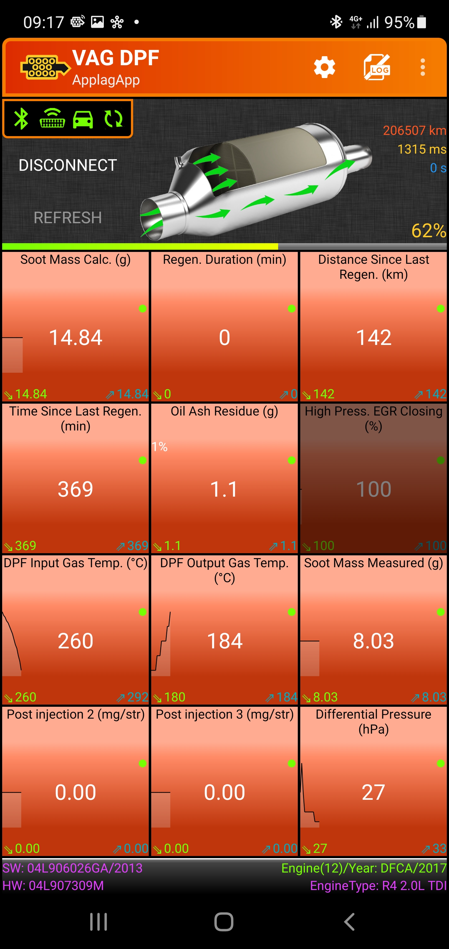 Също остатъчните сажди при мен са си винаги едни и същи без значение дали регенерира или не, като за една година са се покачили с 3%. При теб преди регенерация показва 79%, а след това 0%, което не го разбирам. Да не зависи от версията на VAG DPF.