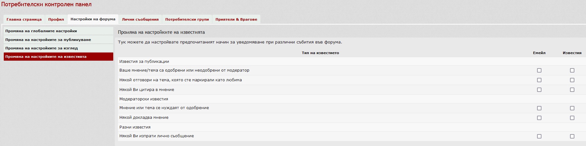 Потребителски панел -> Профил -> Промяна на настройките