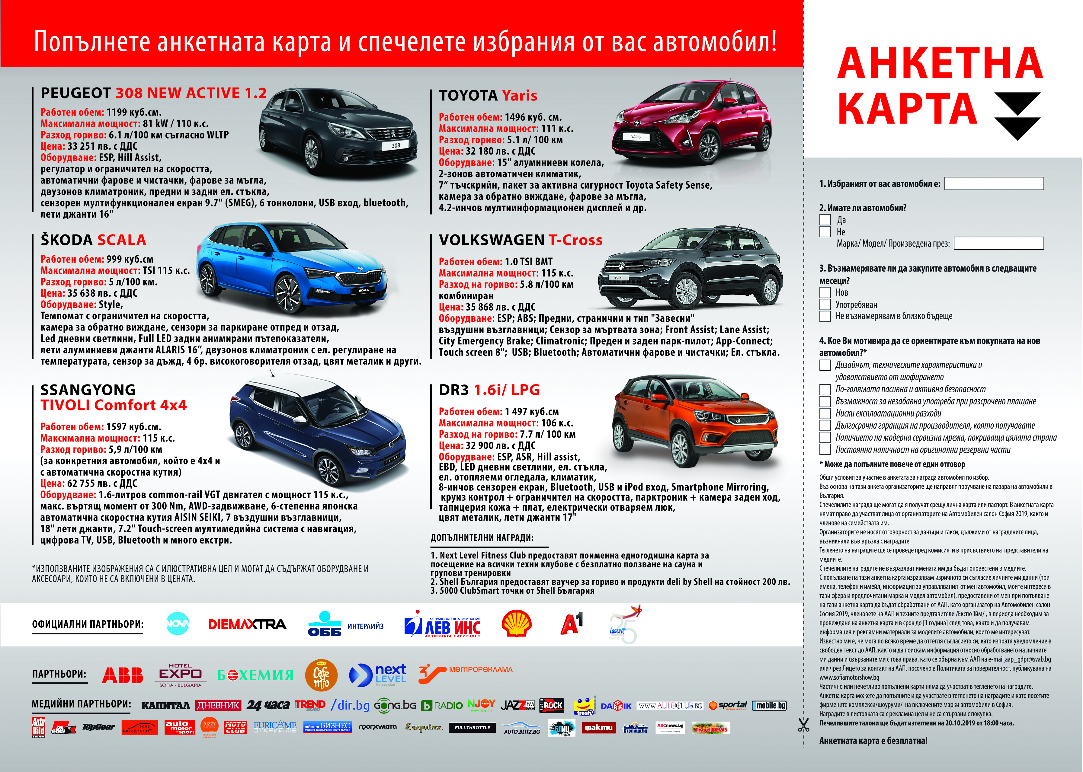 Освен удоволствието да видят, да тестват и да закупят някои от последните модели автомобили, един от посетителите на изложението ще има невероятния шанс да си тръгне с нов автомобил. Изборът е между 12 автомобила с цена от 28 000 до 63 000 лева.