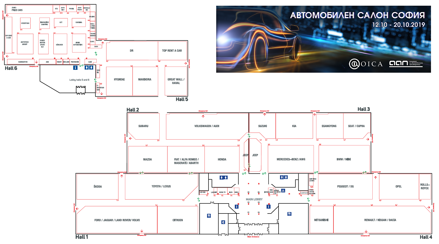 Ето и схемата на автосалона и подредбата на щандовете на изложителите: