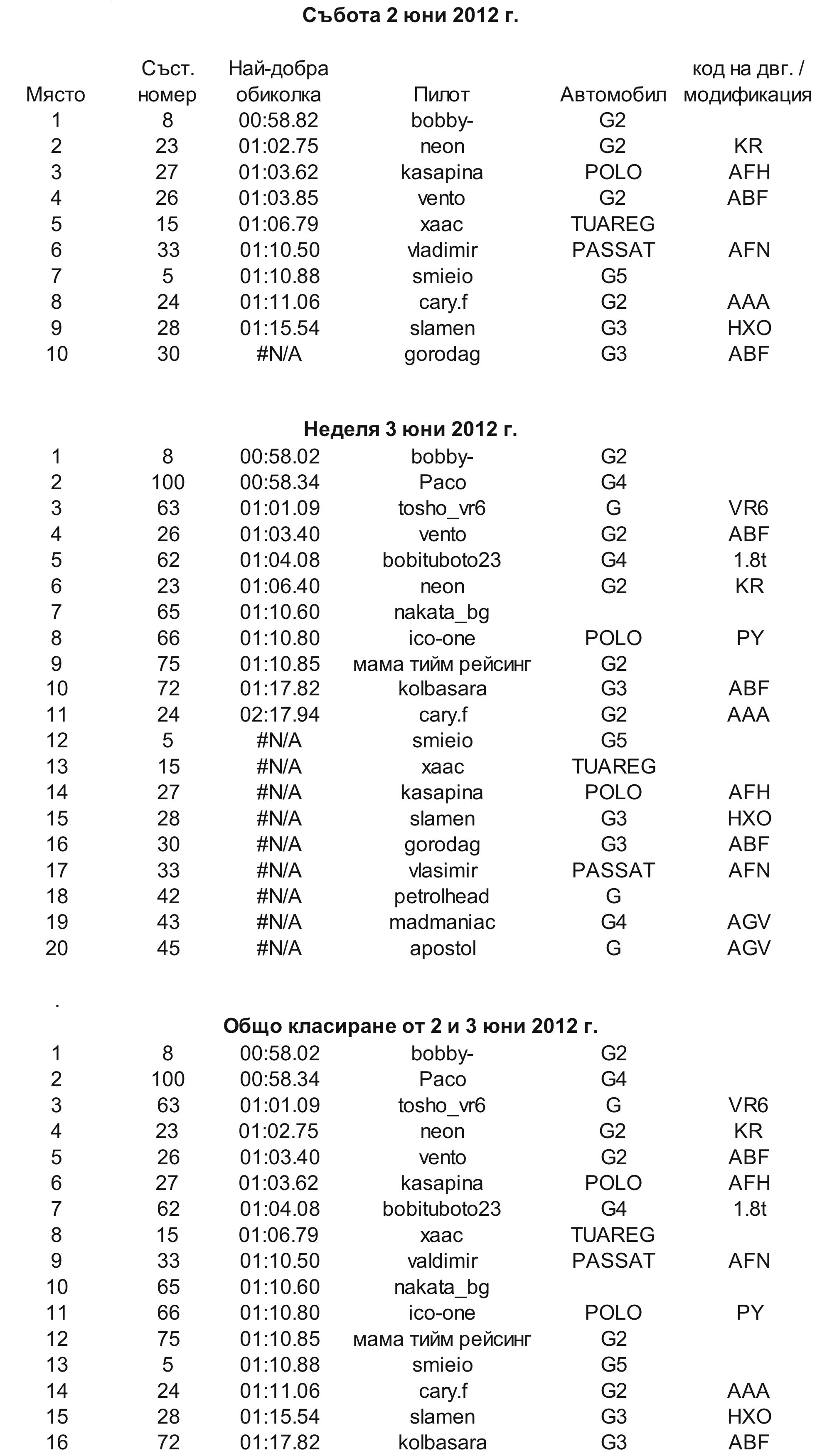В неделя имаше объркване с времената в клас "Малък" заради не добавена сесия от страна на оператора, който работеше с времеизмервателната техника. След поправката и нанасяне на пропусната сесия, 4 ката се измени. Извинявам се за което, въпреки че вината не е наша. След поправката колегата, който кара с теб, отказа да повтори и отстъпи мястото си, друг колега не се яви, мисля поради технически проблем.
