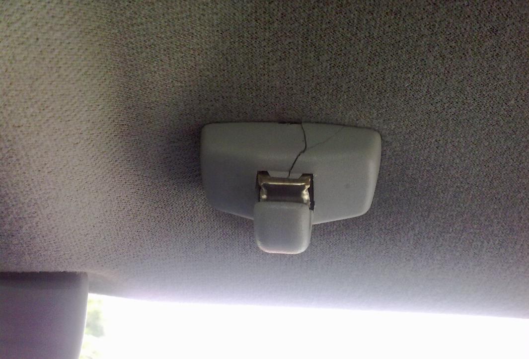 Тъй като едната пластмаса на сенника (тази, на която се захваща) е пукната (както се вижда на снимката по-долу), реших да я сваля и да я залепя, но така и не стигнах до свалянето, защото нямам представа как да го направя.. Ако може малко помощ..