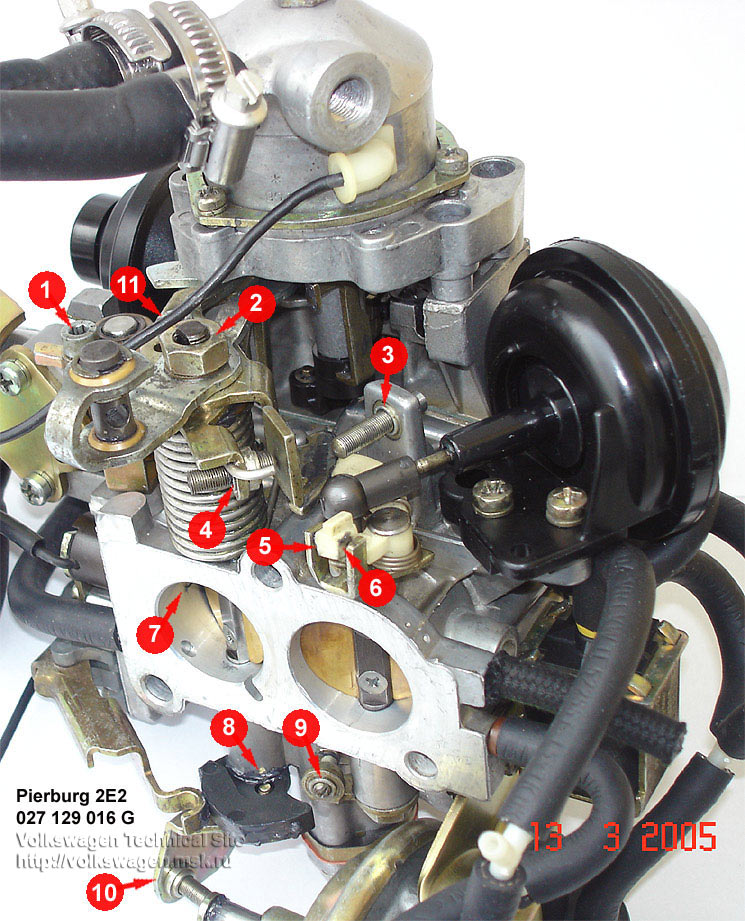Сега по-голямо внимание ще обърна на термоампулата (разположена отпред на карбуратора, в която влизат два маркуча от охладителната система на двигателя) и нейния лост. Обикновено тя е най-скъпия проблем на карбуратор 2Е2 (нова често струва по-вече от 100 лв), защото е направена от пластмаса и с времето въпросната пластмаса става трошлива и ронлива, т.е. въпросната термоампула буквално се разпада. В нея е поместен термостат, който въздейства на лост, въздействащ на дроселовата клапа (леко я отваря) при студен двигател. Регулирането на това въздействие става с шестограмно болтче(вероятно за това болтче питаш, колега?). Развивайки го може да разместим лоста на термоампулата спрямо лоста на дроселовата клапа, т.е. да се регулира въздейсвието на термоампулата върху дроселовата клапа, или казано другояче, да се регулират основните обороти на двигателя при студен старт (при изправен термо-времеви клапан). Въпросното шестограмно болтче е означено с 1, на по-долната снимка.