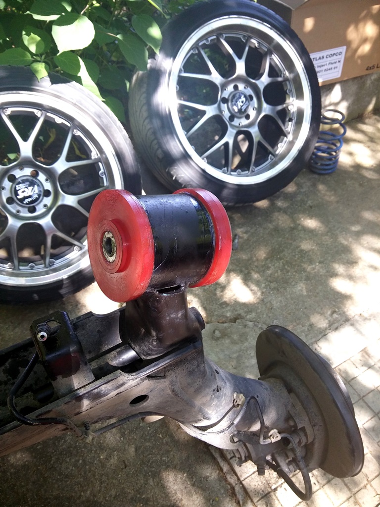Тея въпросните тампони съм ги сменял преди около 5 години. Не сваляхме моста от колата, избихме старите тампони, постояхме малко така и монтирахме новите. Първите който ми дадоха от магазина бяха 72мм с прорези, и понеже не влизат, изчаках доставката на 69мм-те тампони.