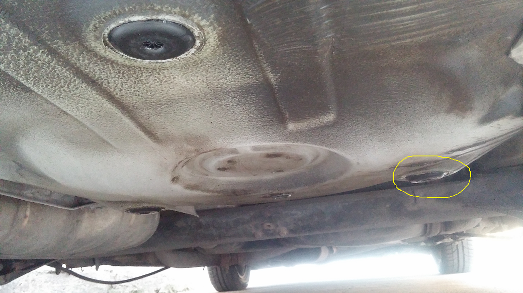 Здравейте колеги, от няколко дни забелязвам малко петънце на земята около задна дясна гума, на допир е леко мазно без мирис. Днес легнах под колата и се оказа, че капките са точно под резервоара. След като го поизтрих се оказа, че гумените "уплътнения" или каквото са там (отбелязал съм на снимката) сълзят леко. При допир се вижда малко течност по периферията и в центъра. След няколко часа престой нямаше и капчица на земята, сега разкарах колата 20 км и като спрях взе да капе веднага. Светло синкава течност, съвсем леко се долавя мирис подобен на бензин, но пък течността е много мазна и не се изпарява изобщо. Някаква идея от какво може да е и каква е течността?