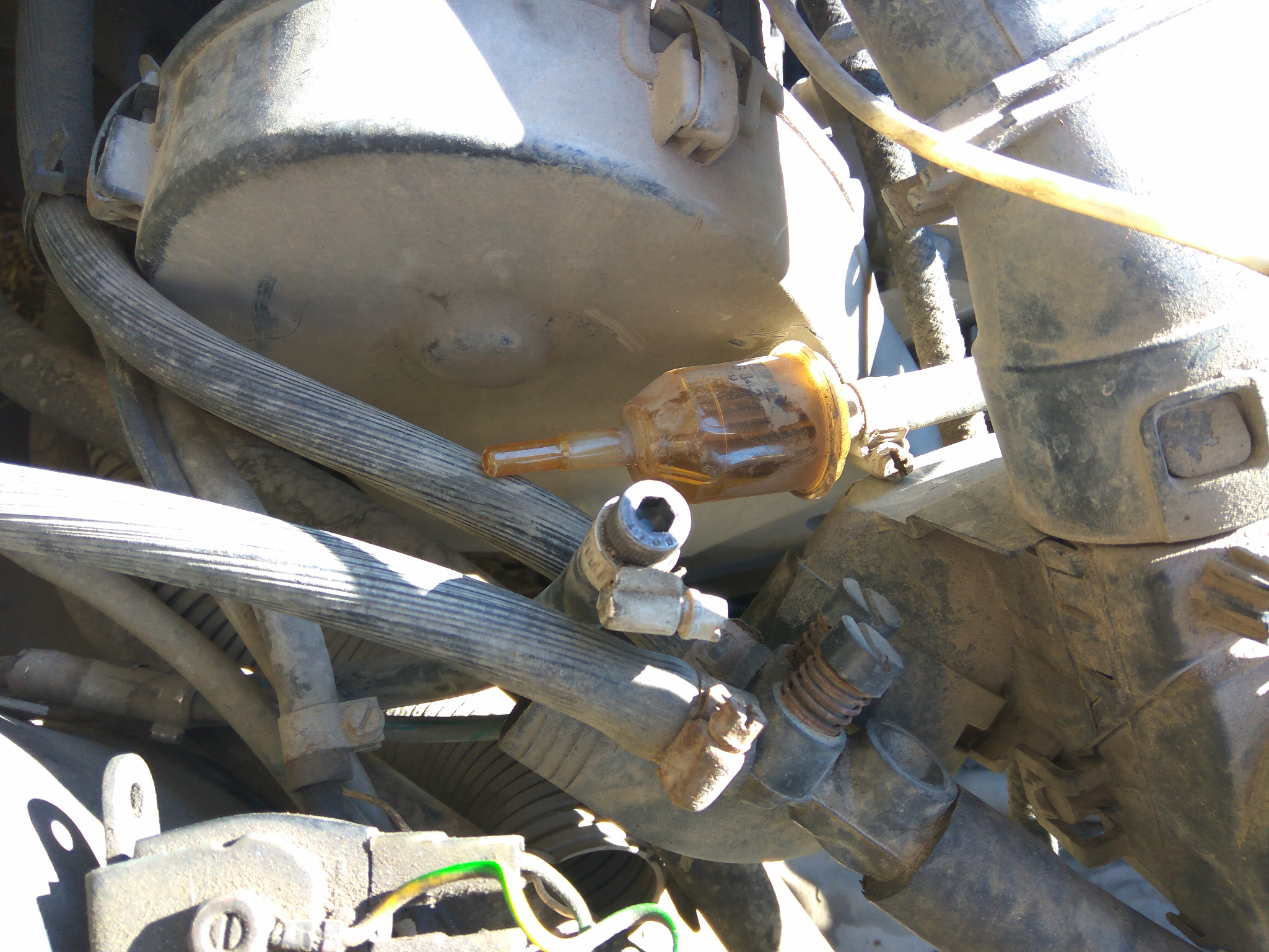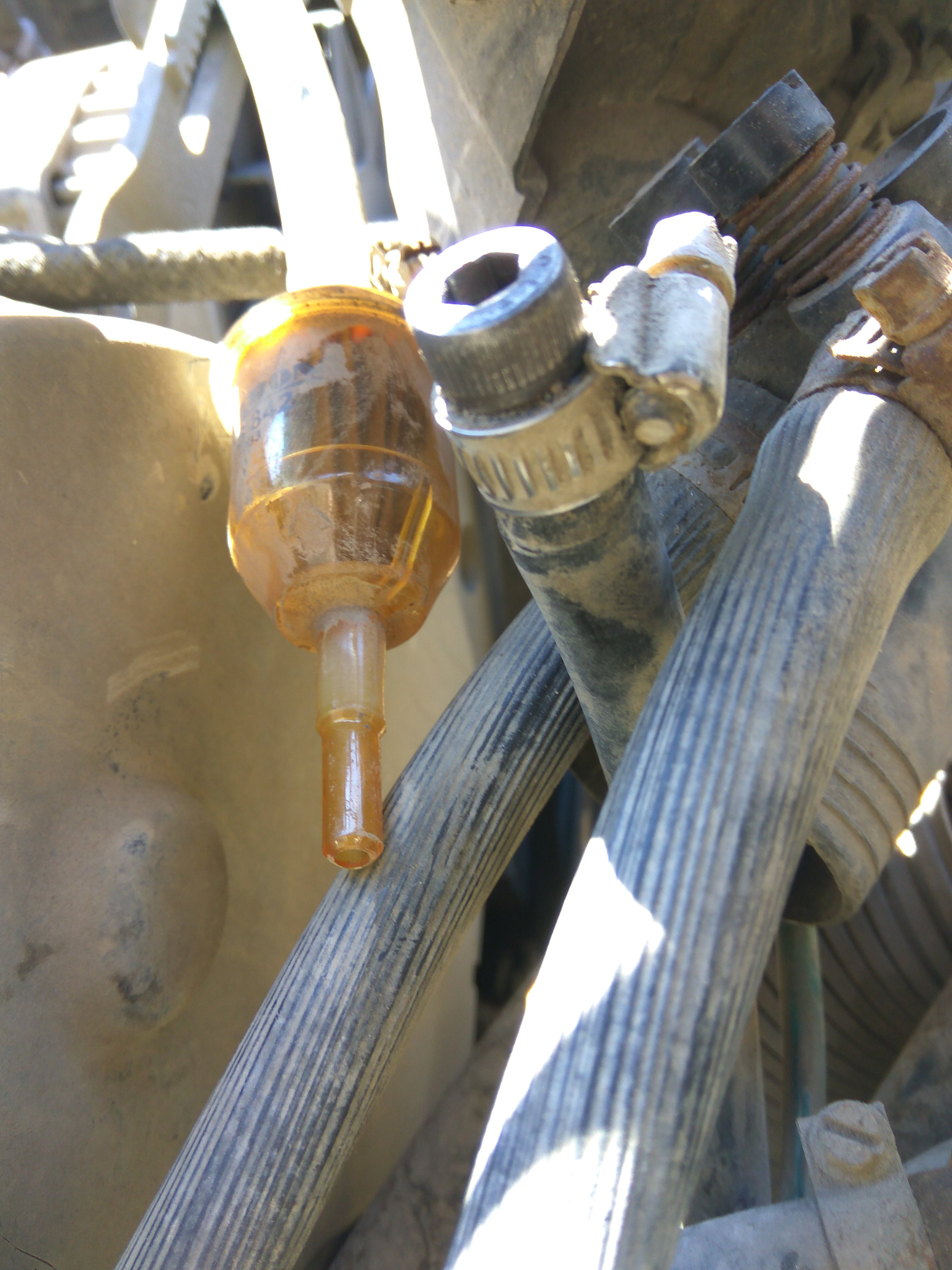 Ето така го направих.Извадих маркуча за бензина преди горивния филтър,мушнах вътре 1 болт и го стегнах със скобата,мисля,че няма да има проблем и няма да тече.Вече като се прибера ще си сменя помпата.