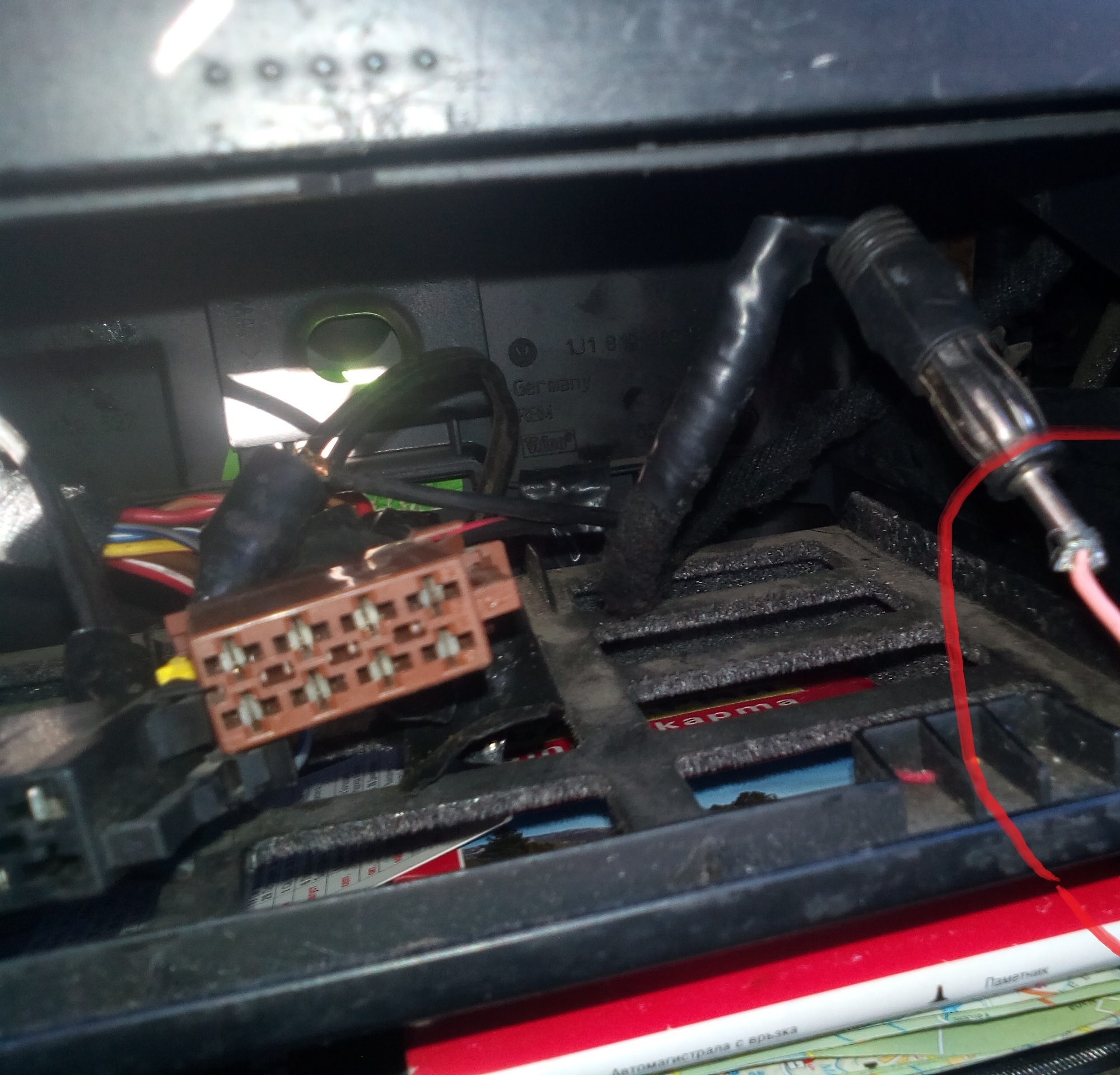 Здравейте! Преди малко махнах музикалното устройство (наследство от предишния собственик), тъй като съм решил да слагам друго. При махането се натъкнах на розов кабел. Беше свързан за устройството в тази металната букса (ако изобщо е букса). Някой може ли да ми каже каква му е функцията, с каква цел е слаган? А този кабел отиващ към жабката за какво е?