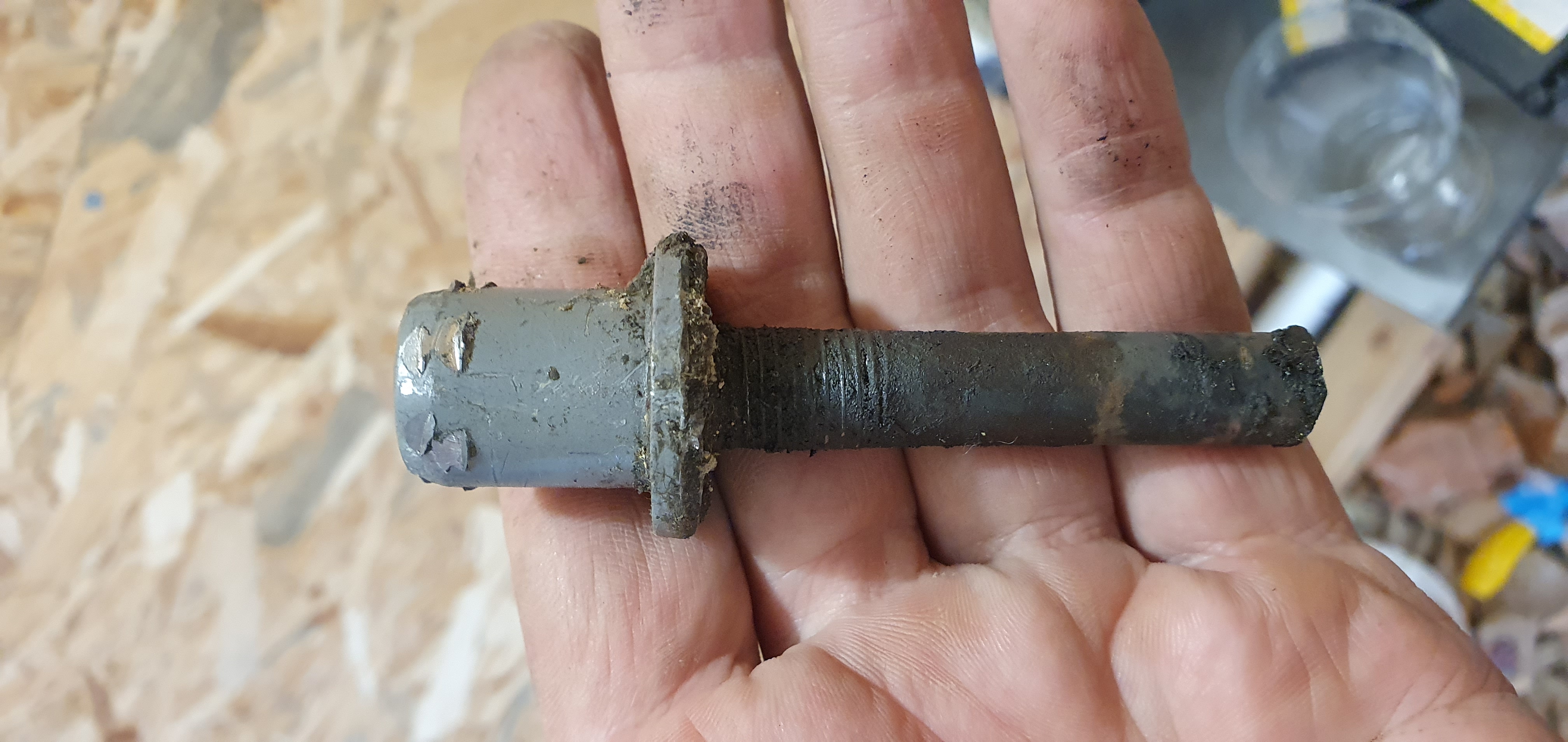 От там в магазин за болтове си купих същия със същата ситна резба и нова гайка.Прибрах колата в гаража,вдигнах я на крика и с помощта на малкия шлайф и дебел диск за странично шлайфане взех да пиля главата на болта от долу.Така докато не я изпилих на пълно и извадих гайката и отрязания болт от вътре в купето през дупката.