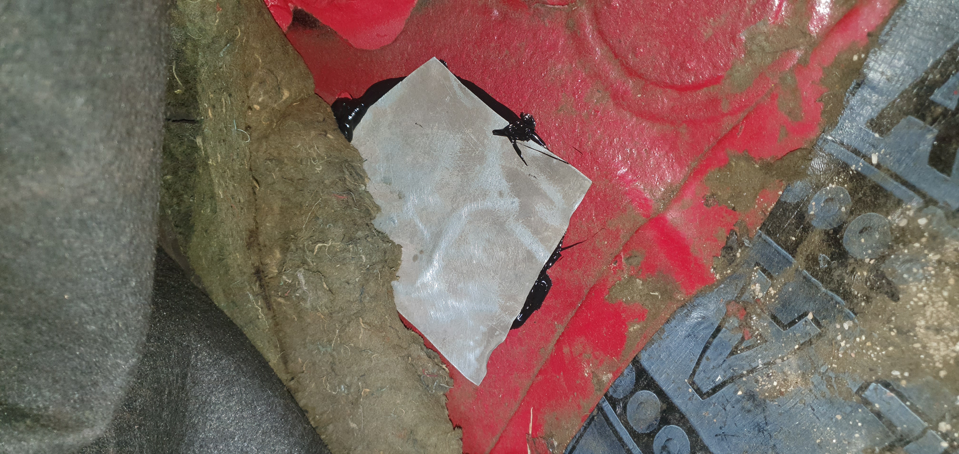 После стягаме всичко с две дебели шайби,понеже новия болт нямаше периферия като оригиналния.Една алуминиева ламаринка залепих със полиуретаново лепило и стана като ново.