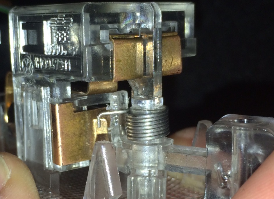 преди малко я сглобявах както каза последния колега пружинката се навива около палчето, аз я навих с една тънка отвертка и чак тогава се сглобява като се внимава пластинките да си влязат на местата в улейчетата, бавно,палчето трябва да стои натегнато като се сглоби и двата края на пружинката да опират в двете пластинки ,когато натиснете палчето се отваря веригата гледайте добре последните снимки и успех :-)
