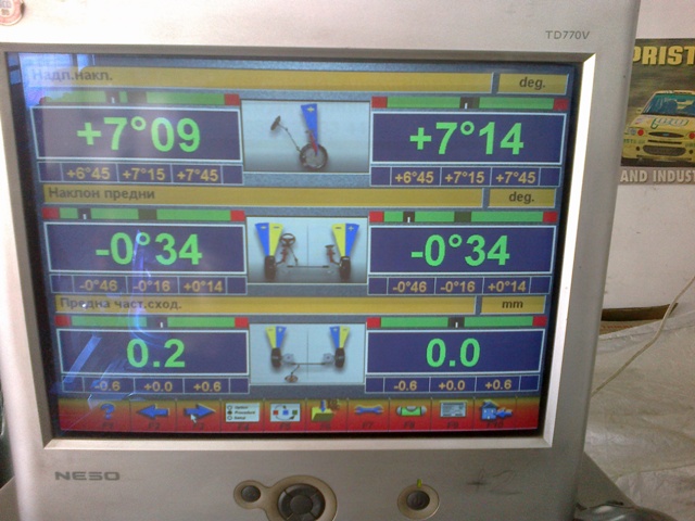 Регулираха отново предницата - светна им 1 червено число и едно жълто на дисплея, те ги нагласиха да станат зелени. Казаха че са увеличили леко сходимостта и всичко било наред.