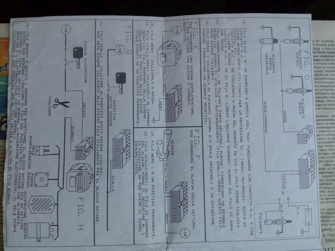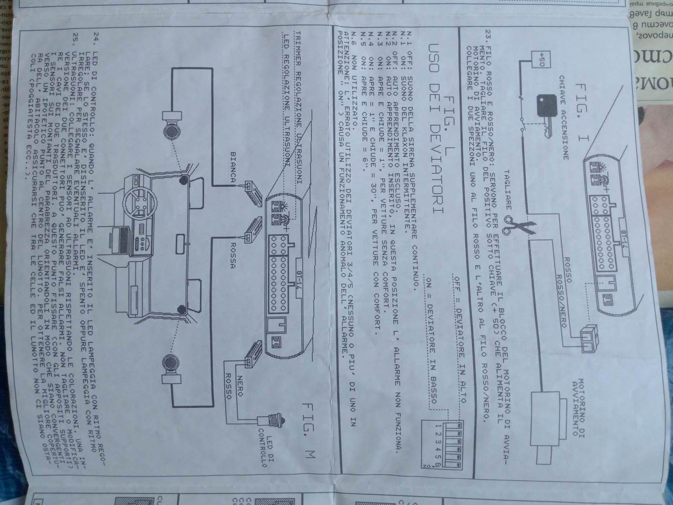 Релето за алармата на самата бушониера ли да го търся или е някъде хвърчащо? Откачих бушониерата и там се виждат доста кабели, някои от които овързани с изолирбанд. Изкарах и 2 кутийки, които незнам за какво са (последните 3 снимки). Пробвах докато въртя на стартер да меря на буксата на бобината, но ги няма 12-те волта. Намерих схема на свързване на алармата при документацията на колата, прилагам снимки по-долу. Нали бях споменал, че не свети индикацията на кутийката (незнам как се нарича) за смяна на бензин-газ в купето. На нея има червен бутон за електронния клапан на газта, но като го цъкам сега не става нищо, тоест няма захранване и клапана не вкарва газ в изпарителя , предполагам за това не иска да запали колата. Та предполагам проблема е някъде по тази верига. Кабелите от тази кутийка за газ-бензин отивам директно под капака на колата до едно реле (ще направя снимка ако се наложи), но не знам как мога да го проверя дали то работи.