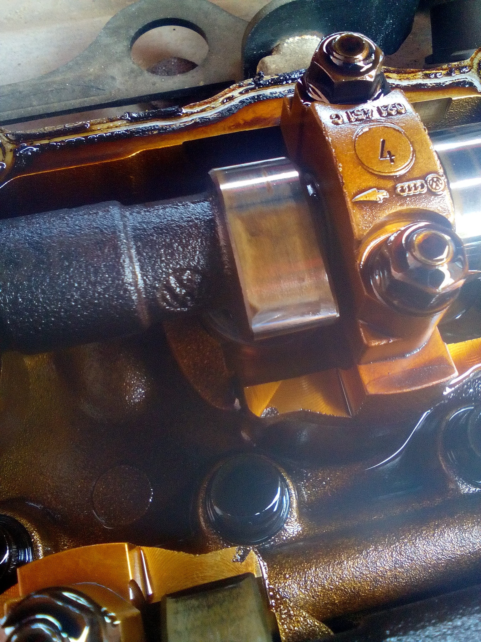 - Като гледам не си чел достатъчно за специфичните неща за VR моторите (като цяло) погледни тази снимка за "белезите". В случай, че си махнал само горния капак трябва да се съобразяваш: 1 цилиндър ГМТ, процепите на валовете, белега на шайбата на коляновия (с нея ще знаеш в какво положение е коляновия вал), понеже без да махнеш и долния капак на веригата не може да видиш белезите от другата страна при веригата. Трябва всички тези 3 неща да са на позиция ако си в ГМТ и няма нищо прескочило, а в случай че си свалил и долния капак трябва да погледнеш и зъбното колело на маслената помпа, и зъбното на коляновия, но в случая няма как да ги видиш без да свалиш долния капак за това ще се ориентираш по другите три белези. Ако не е 4motion е доста по лесно да свалиш кутия в домашни условия, по малка, по лека, повече пространство, не махаш моста с носачите, голям зор е да откачиш раздатката от блока, кардана, тръбите след изпускателите с катализаторите, абе много по лесно и бързо става.