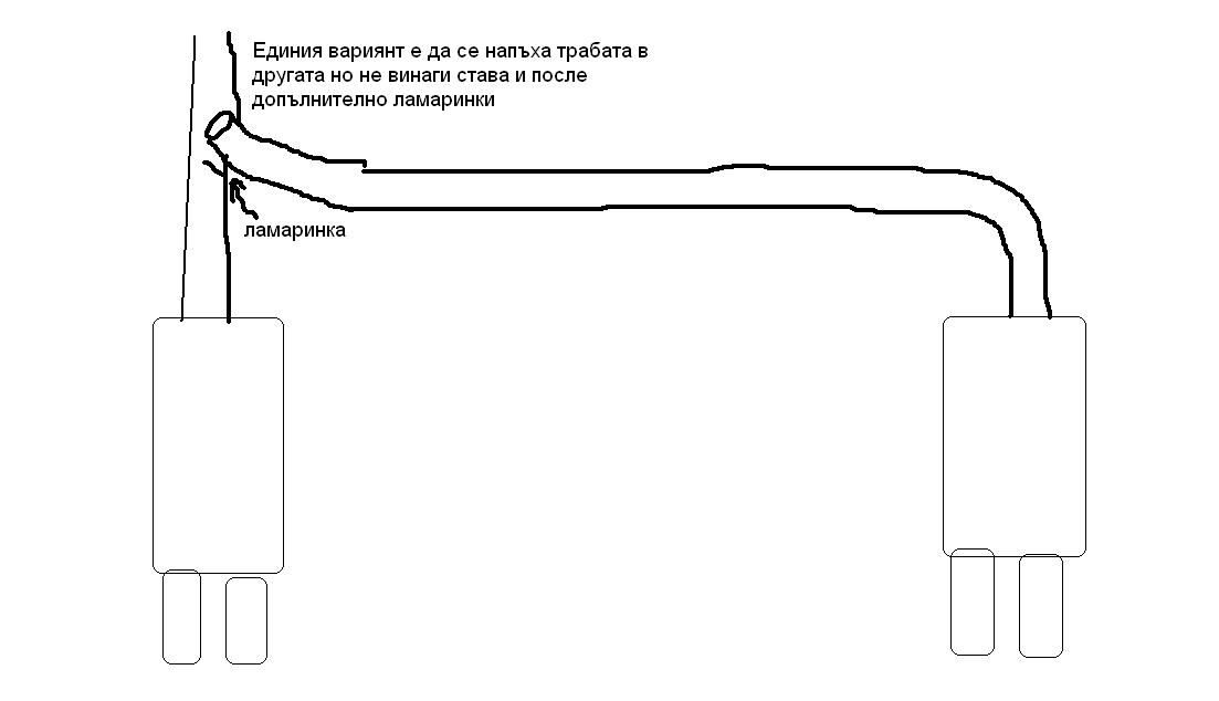 И аз съм правил 4 цевка със 2 задни гърнета обаче майсторлъка не е в това да се сложат еднакво ми пушека да излиза равномерно! Става защото при сички положения дясната тръба ще е по дълга и на газовете ще им е по лесно да излизат през лявата. Става като се сцепи трабата малко след мястото на раздвояването и се сложи ламаринка която да ограничава газовете към по-близкото гърне! и се пробва колко дълга щото на сяка кола е различно, ако не се улучи от 1 път се слага още една докато ти хареса как изкарва от двете!