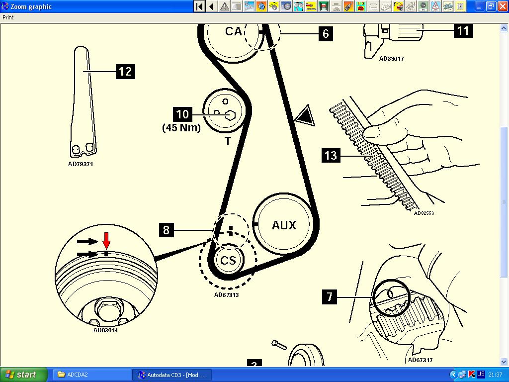 днес проверих зацепването на ремъка.... докарах репера (едно лъскаво нещо) на скоростната кутия до прозорчето и снимах другите то4ки къде са.