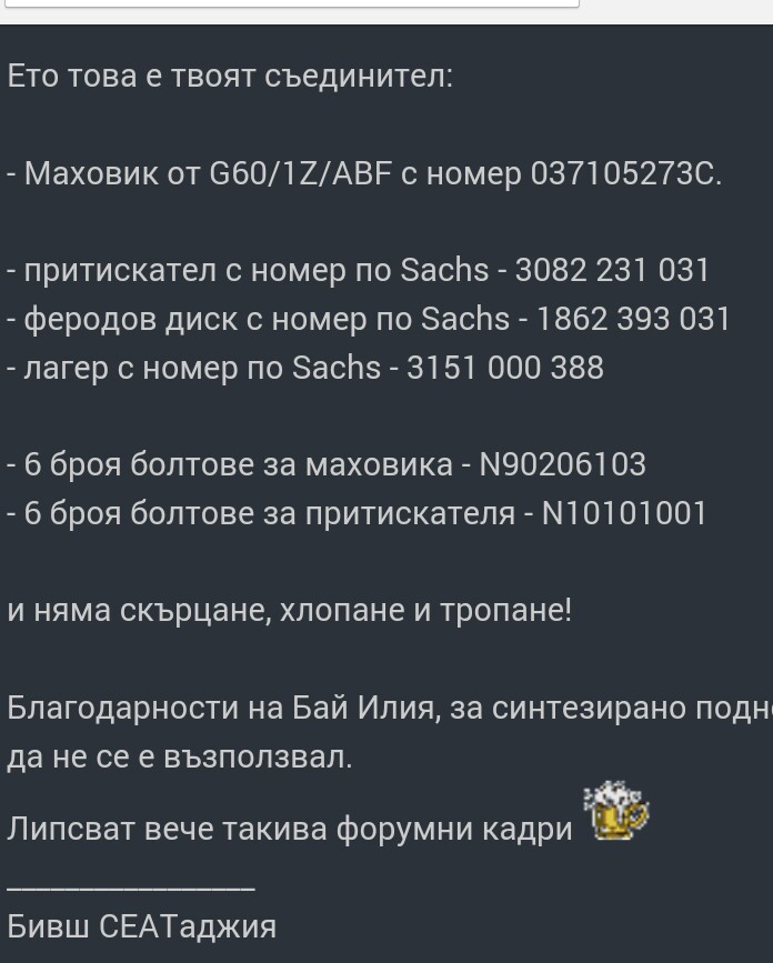 Всичко пасва както трябва колега,аз болтове имах но си купих нови за всеки случай.На мен ми легна около 320 с болтове те,лагера,феродото и притискателя,но без маховика е тая цена