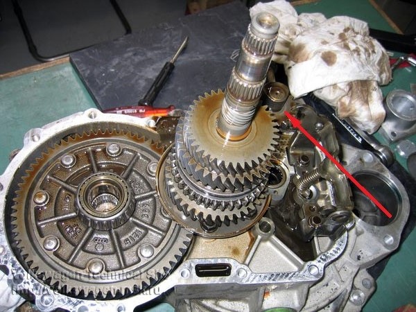 Мястото му е от горната страна на скоростната кутия (където съм го белязал на втората снимка), а самото зъбно колело на задната е там някъде отдолу, под първичния и вторичния вал (вижда се на третата, като там първичния вал е изваден).