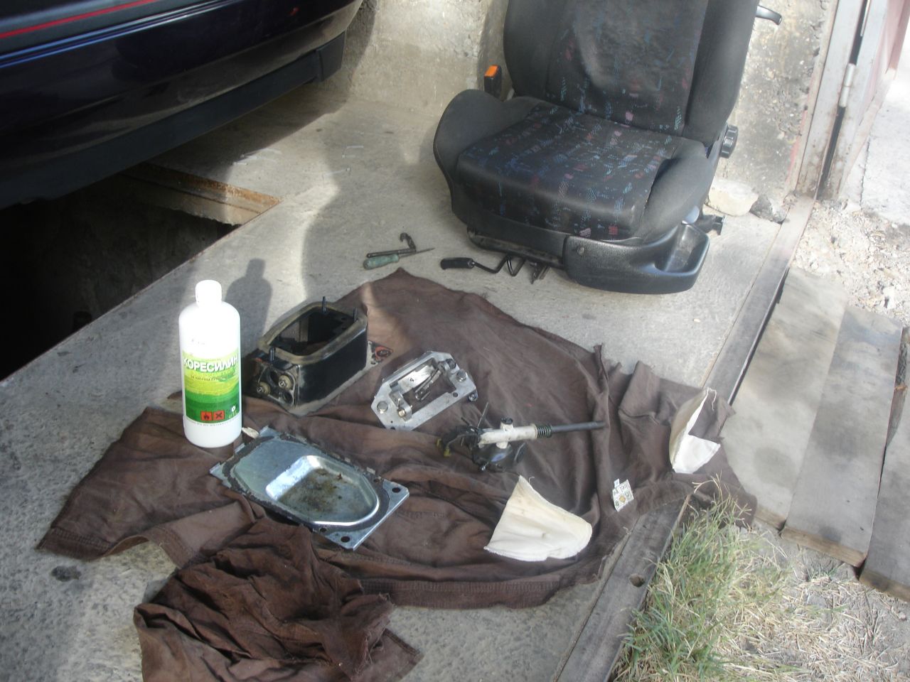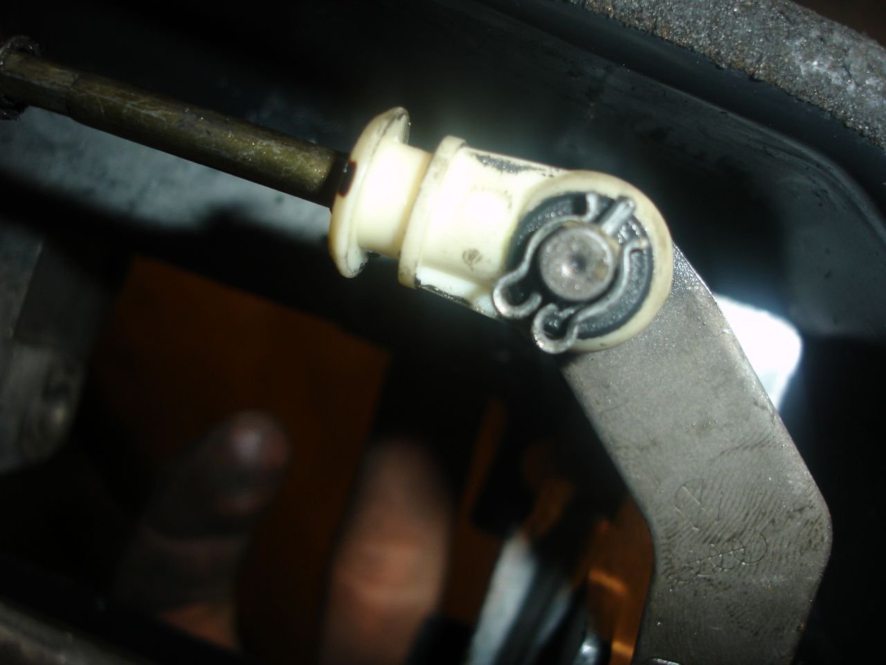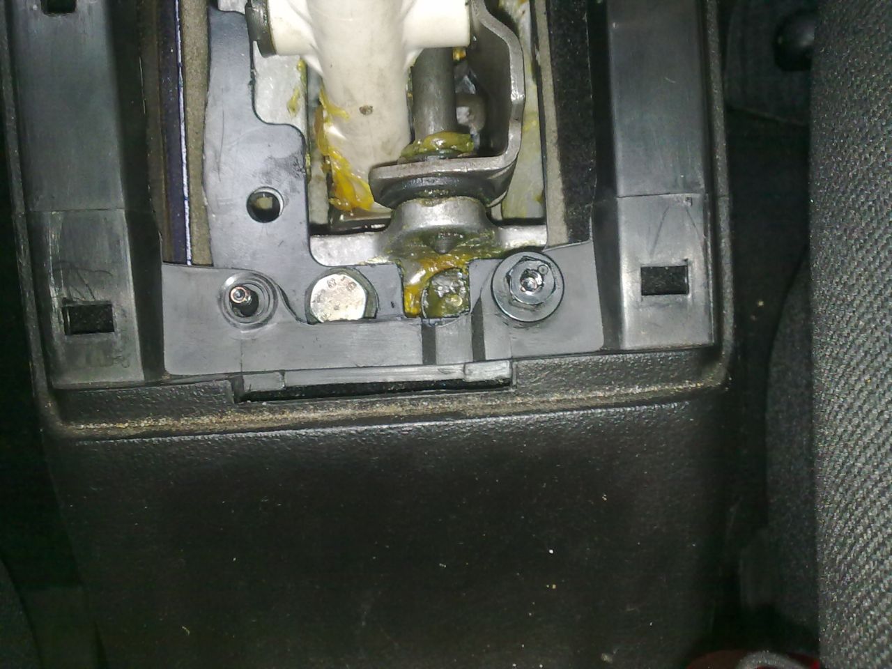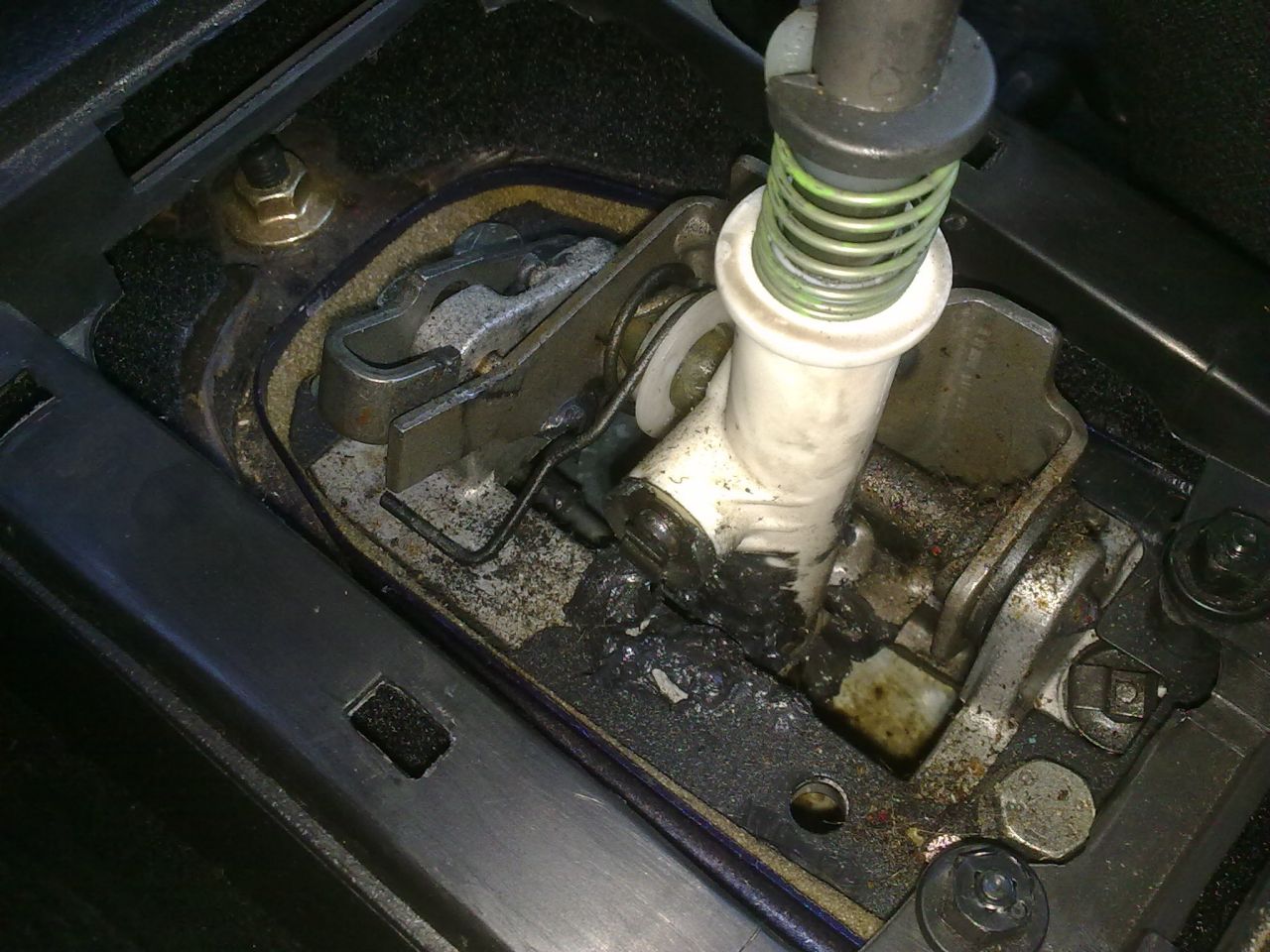 Понеже не обичам нещо по колата ми да не работи и аз да я карам така, когато се появи луфт в скоростния ми лост започнах да се нервя и исках да го оправя. Като я купих преди 2години и половина скоростите влизаха много добре, като изключим, че леко хъркаха първа и задна, но им хванах чалъма да не хъркат. От миналата зима започнаха по- трудно да влизат, но си мислех че е от студа. Да ама като се затопли пак така и нещо лоста взе да се клати наляво надясно много свободно като на москвич :mhihi . Махнах пластмасата която е с маншона около лоста и видях следната картинка