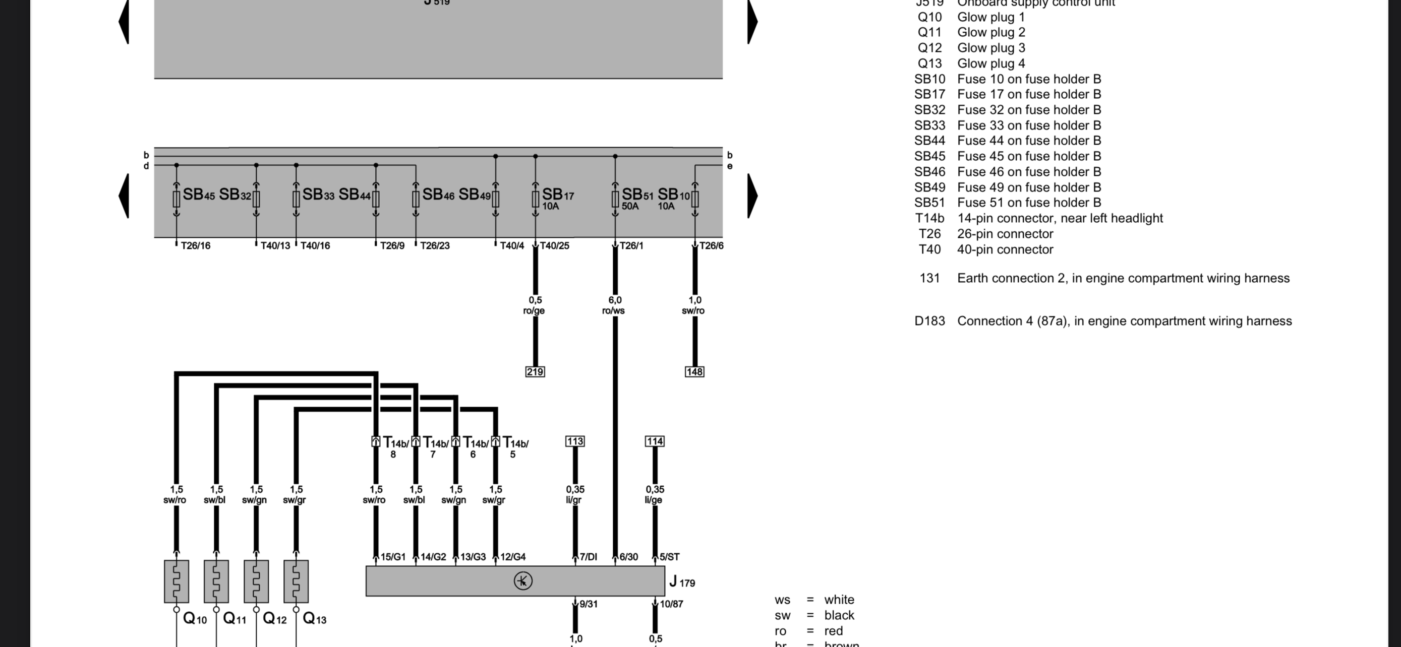 Купих си нови лули за подгревните свещи и от прикачената схема виждам, че трябва четирите кабела да ги включа към конектор t14b. Намерих един 14 пинов конектор около кутията на въздушния филтър и акумулатора, но цветовете на включените в него кабели не отговарят на тези от новите лули. За това предположих че това е t14a конектор.