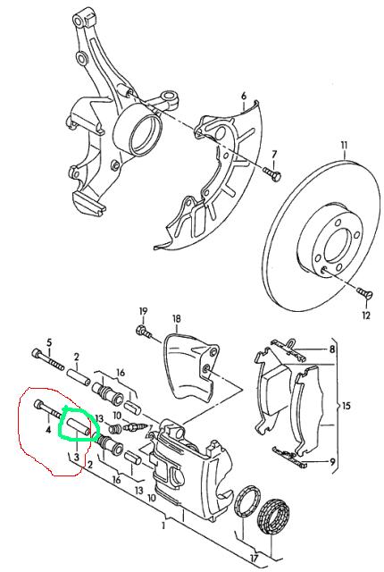 Чесно да ти кажа аз съм си оправял или по скоро сменял накладките сам и лично според мен този болт и втулката ти спомагат за по доброто закрепване на апарата към главината и така нанатъка. Единия варянт е когато натиснеш спорачка да се "измества" апарата заради получения луфт. Втория варянт е просто феродото на накладките да е гадно. От това може да ти скърца. Но аз лично залагам на бторото.