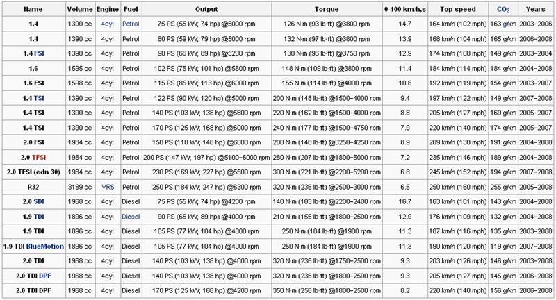 Здравейте, търся таблица с двигателите монтирани в Голф 5 през всичките години на производство