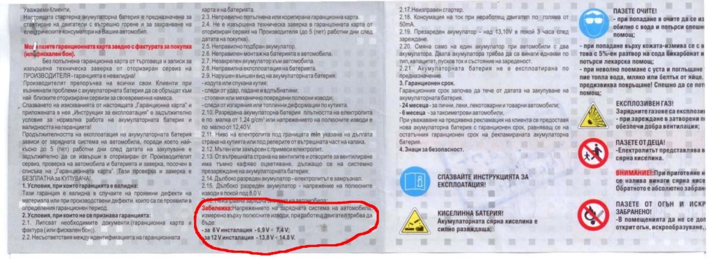 Току-що си погледнах и гаранционната карта и описание на акумулатора, където също пише норми 13,8V - 14,8V - искаш ли да ти го сканирам???
