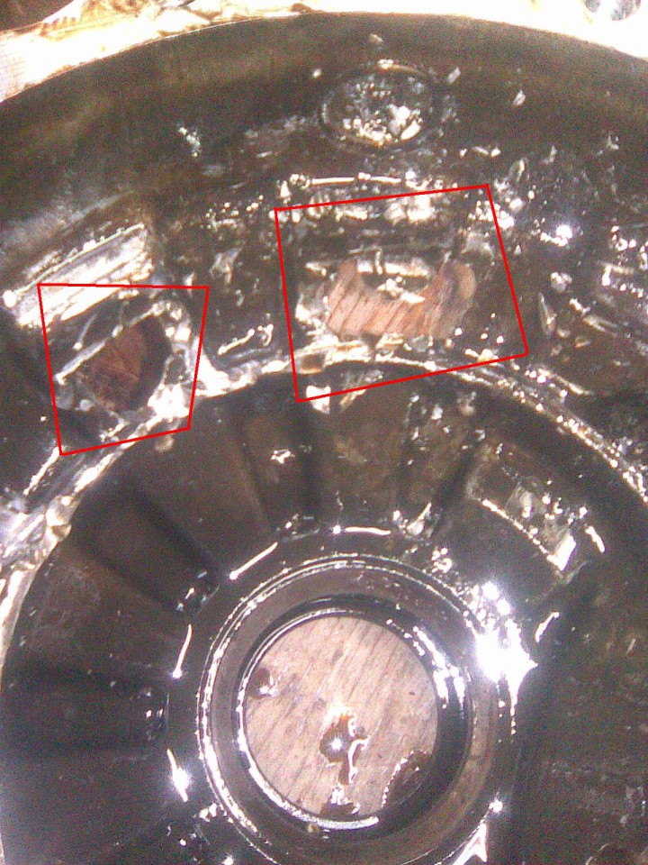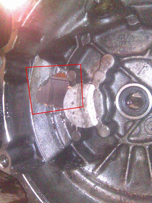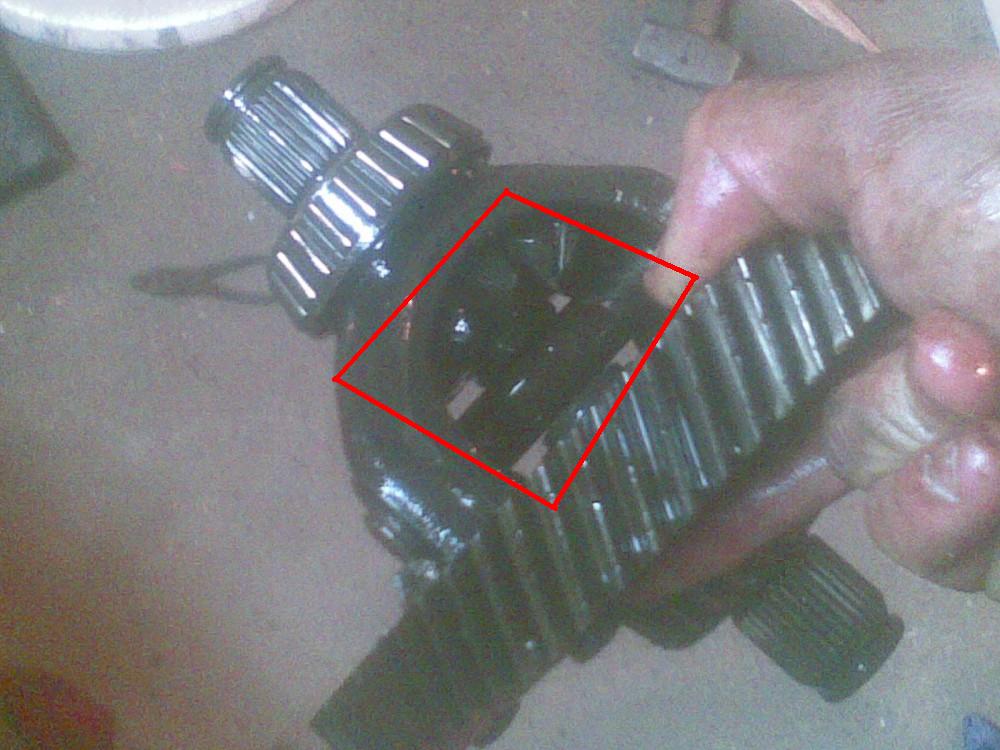 вчера се случи нещо ужасно тръгнах от един паркинг и да сложа на 2-ра скорост но се чу едно тракане спирам аз и гледам диря от масло зад колата,лягам отдолу и гледам че от диференциала на скоростите тече масло стабилно.Свалих скоростите и се видяха големите дупки в кожуха на скоростите пр диференциала,след това отворихме скоростите и открихме проблема при задвижването на диференциала имаше две счупени зъбни колела ето тук: