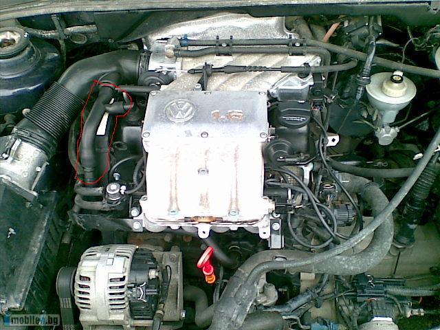 братле... нз точно ама като гледам то е част там от въздушния път... ако не тече нищо от него минава просто въздух само.. и нямаш проблем.. Въздушния филтър ти е най-отляво.. после я виждаш голямата тръба там минава въздух и после това е свързано с нея.. според мене минава въздух от там, но все пак и други колеги да пишат.. не съм сигурен точно за какво е..