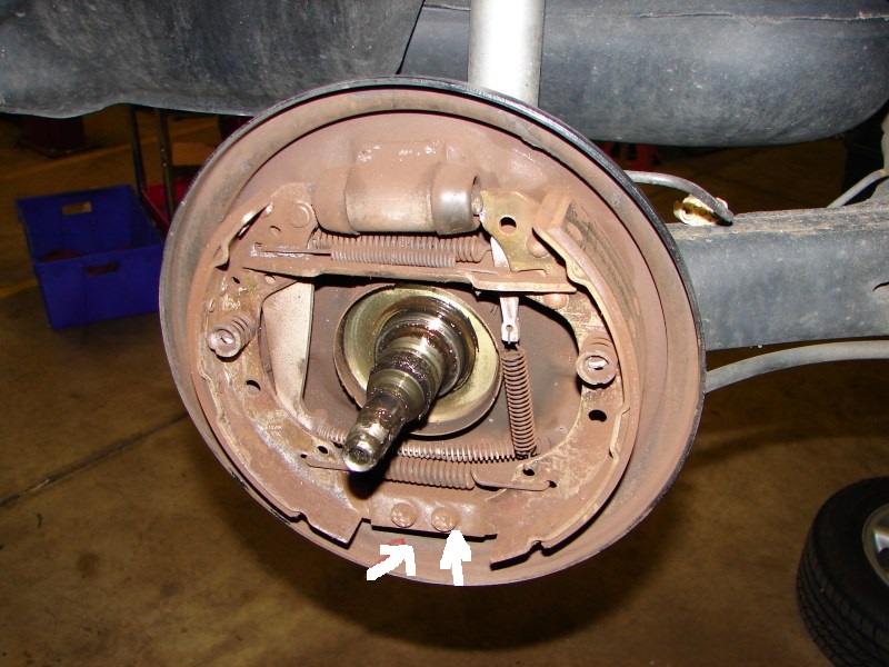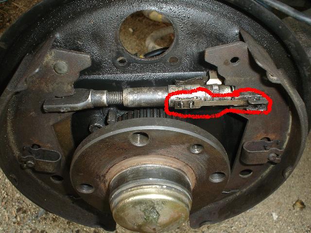 Между двете накладки.От горната страна над оста на лагера стои перпендиколярно на накладките.На него има едно зъбно колелце с пластинка,която стои за контра да не се връща.Така при износване на накладките ако регулатора работи безпроблемно накладките се саморегулират в следствие на отварянето на този регулатор.Ако колелцето е запекло или пластината я няма при износване на накладките ефективността на задните спирачки и ръчната дръстично намалява.Ето една снимка,за да можеш по-лесно да се ориентираш.(не е от голф,но е на същото място)