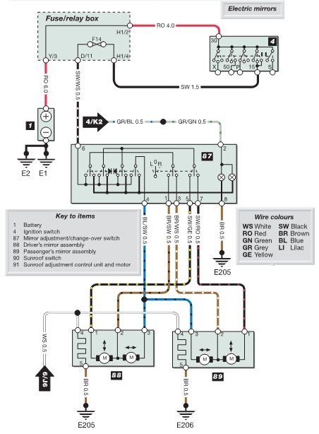 В схемата няма реле, огледалата работят при контакт през предпазител. При теб захранването ще го вземеш с обикновена женска кабелна обувка от клема G1 отзад на бушониерата. За другите неща правилно си се досетил.