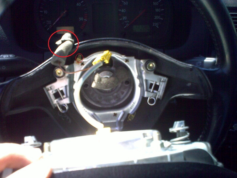 Някой знае ли дали тази клема която е нещо като изолирана с дунапрен(в голямото червено кръгче)дали трябва да е вкючена в малкото оградено кръгче.Питам понеже това с дунапрена беше завряно в дупката за отвиване на самия волан.И за какво служи? А жълтата букса си беше вкарана, аз я махнах за момента.Причината е в това че не ми работи клаксона тромбите и бушона са ок, релето незнам как е не се чува да цъка .