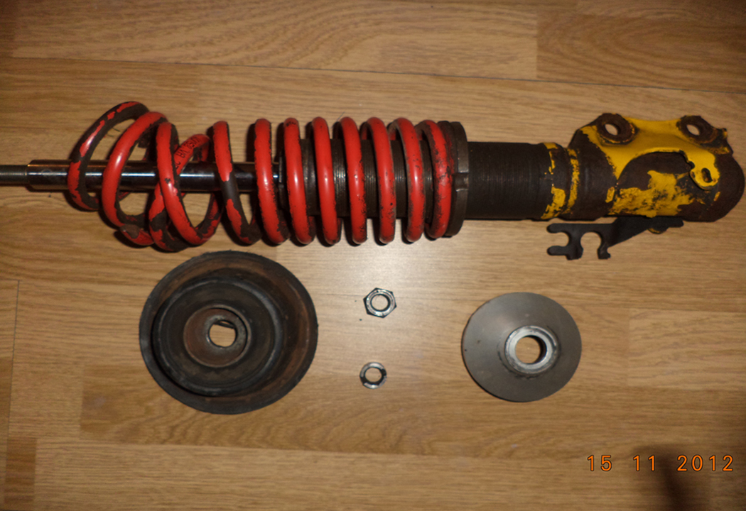 На пръчката на амортисьора се слага чашката която държи пружината, тя пък лагерува с лагера на тампона и това е отдолу, а отгоре слагам другата чашка и я пристягам с гайка.