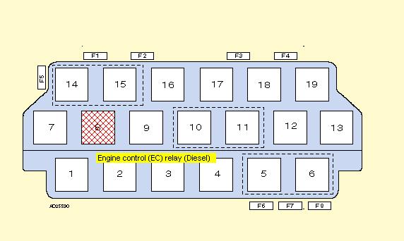 -Engine control relay и релето за горивната помпа ( номера 4 и 8 на картинката по-долу, бушониерата е при педалите). Отвори ги и виж дали имат спукани спойки (това поне отнема 10 минути)...ако има нещо,ремонтирай (не е зле и профилактично да ги презапоиш).