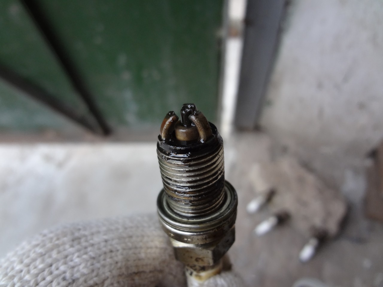 Разстоянието между централния електрод и страничните трябва да е от 0.8 до 1 мм, зависи от марката. В ЕТКА - та ги има. Ако е в границите почисти ги и ги слагай. При мен на 1-ви цилиндър е такава свещта /омаслена/.